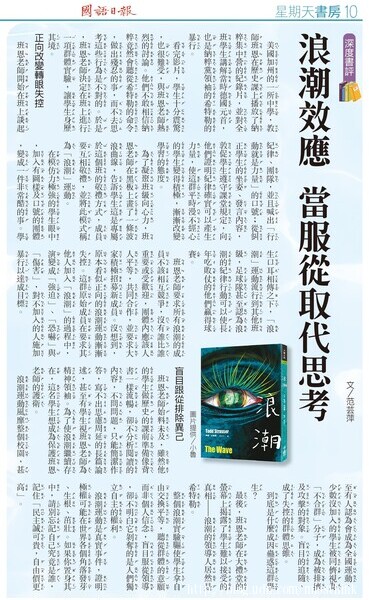 浪潮運動是真實事件,證明極權可能在世界各個角落發芽、生根、茁壯。如果你置身其中,請別忘記自己究竟是誰,記住「民主誠可貴,自由價更高」。