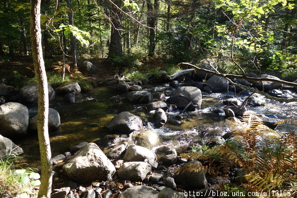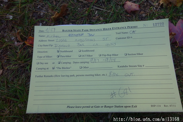 7:20離開進入Baxter州立公園前那條土路的紮營地。昨天下午我在艾柏橋邊(Abol Bridge)的雜貨店湊巧遇到了公園的維護員(Ranger),他幫助我登記好今晚的住宿手續,只要下午2點前去報到繳現金$10就好了。他還告訴我,只要不過木橋露營是准許的,而我的營地離木橋還有點距離。可能還是有那麼一點點偷露營的嫌疑吧,昨晚一夜沒睡好,也不完全是這個原因,因為這次長距離的健行也接近尾聲了,所以感觸特別多,心情錯綜複雜,陸陸續續起身好幾回,把盤旋在腦中的思緒寫下來。
