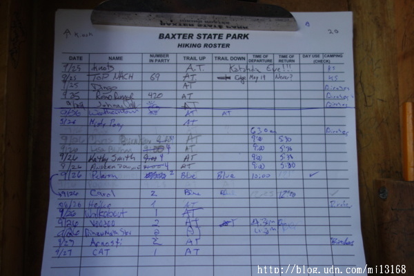 12:20出發不久,路況突然變好了,這是少見的現象,因為沿湖邊的路況一般是較差的。不一會碰到一條叉路Grassy Pond Trail(2179.1),往左上方上坡,從此是不錯的路況直到露營地Katahdin Stream Campsite(2180.1),這是給一般遊客使用的露營地。從停車場旁的橋過去後,那棟唯一的房屋就是維護站的辦公室,進去報到繳$10現金,維護員會給你一張登記單,上面就是今年你是第幾位登頂的號碼,我是第681位。其實我的號碼應該提前約20位,因為我到達時辦公室關的,我就先去木屋休息了,後來4點多才來報到。這張登記單離開時自由決定繳回給公園處,我留著當記念品。走去木屋前先挑一個背包裝你明天不帶去山頂的東西,因為原路去回,一般只帶食物飲水相機重要東西即可。木屋有廁所沒有水源,記住在維護站前的橋下接滿水才去木屋過夜,免得來回跑。從維護站左邊的路走出去,很快到一條叉路,向左轉,前行不久右邊就會出現木屋The Birches的標誌了,廁所在路口。木屋有兩棟任選一間都可以,也有山友自搭帳篷,祝福你明天登頂順利成功。