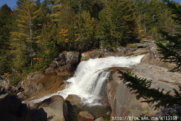 8:45山徑從沿主流轉往支流 並且產生一座小瀑布,旁邊是一大片還算平整的岩石,今天行程輕鬆,在此第一次休息。9:15離開,轉入支流的路況就變差了,9:45走到需要涉水兩次的河流Nesowadnehunk Stream(2174.8),在這裡也出現了山洪暴漲時AT環形便道High Water Bypass南端指標。第一次過河分兩段,先過細細的雙木橋,然後是踩石而過。第二塊石頭距離較遠,雖然我已極端小心,還是滑了一下。幸好河水不深,我也警覺趕緊站立跳開,只是鞋襪皆濕,褲管和相機外殼濕一些,背包完全無恙。10:05走到第二次涉水就比較簡單了,有很大的岩塊在河中央,踩過去就行了,在此出現了洪水便道的北端指標。雖然走支流的路況較差,但不得不承認風景比主流美觀。10:30走到位於叉路內僅150英尺的大奈爾瓜瀑布(Big Niagara Falls,2176.6),風景不錯,值得一看。