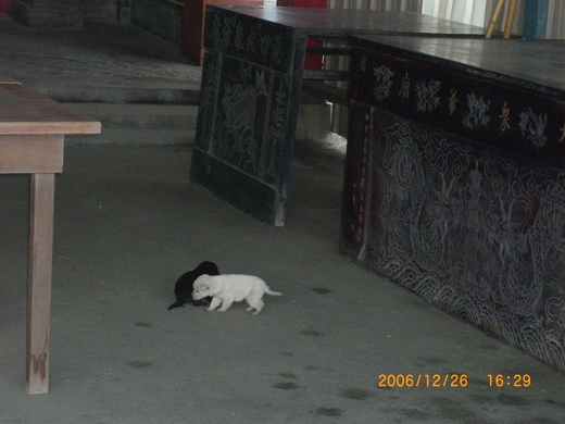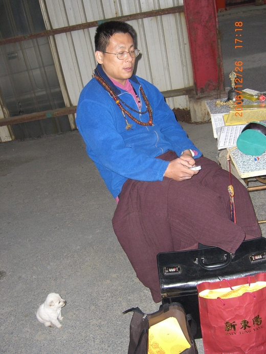 那天漁港旁的大眾爺廟是我們常去的地點,出現了兩隻黑白小小狗,小白狗走到黃董的腳邊,安靜地坐下來,好像也專注得聽著黃董持咒.