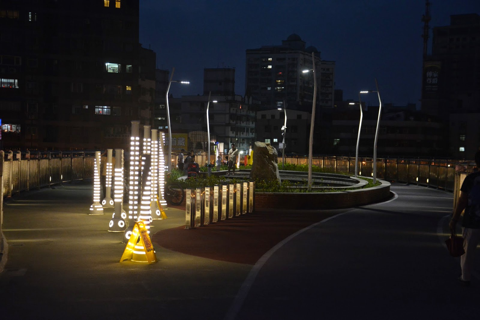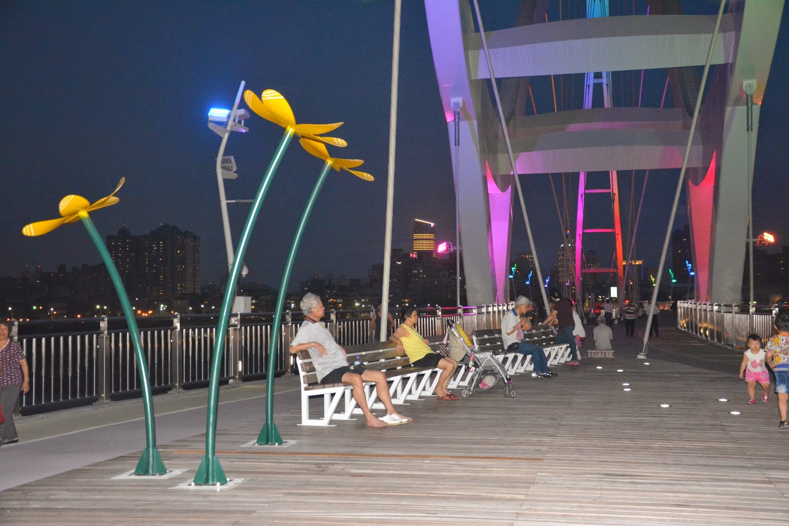 雖然,新月橋觀景休憩平台,包括:曲之藝、光之影、水之舞及風之律,四個主題。實際上走在大橋上可以明顯感受到的造景藝術,以風之律及水之舞令人印象最為深刻。曲之藝是位於左岸入口有“新月“二字的石碑為主的原木休憩區,橋中間的光之影也是原木地板休憩區,在夏夜最受人們喜愛。大批的遊客喜好在此乘涼、欣賞街頭藝人表演(每週六、日晚上到9:00)許多人攜家帶家一直到深夜仍陶醉在夏夜晚風中!