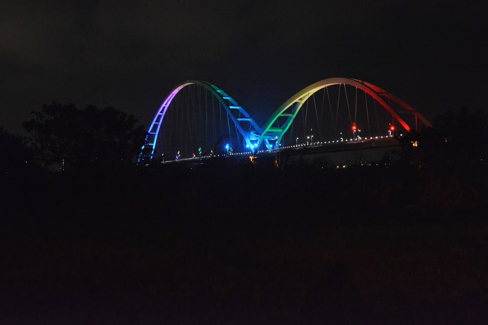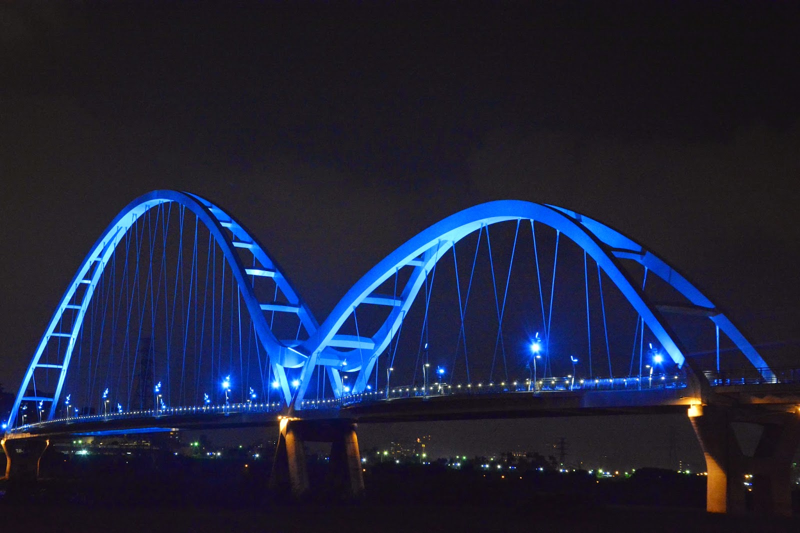 白天的新月橋,主體是白色的。橋的線條,是兩個不對稱的拱形,簡單俐落而優美,跨坐在藍天下的草原上,為整個大漢溪增添不少光采。到了晚上,七彩光雕,變化無窮的光影,更令人驚豔!不論是在橋上直接感受光的變化,或是在遠處觀賞光影的律動,都能有不同的感受。對於新月橋,我只能說,她更貼近人們的生活,是城市居民最佳去處。