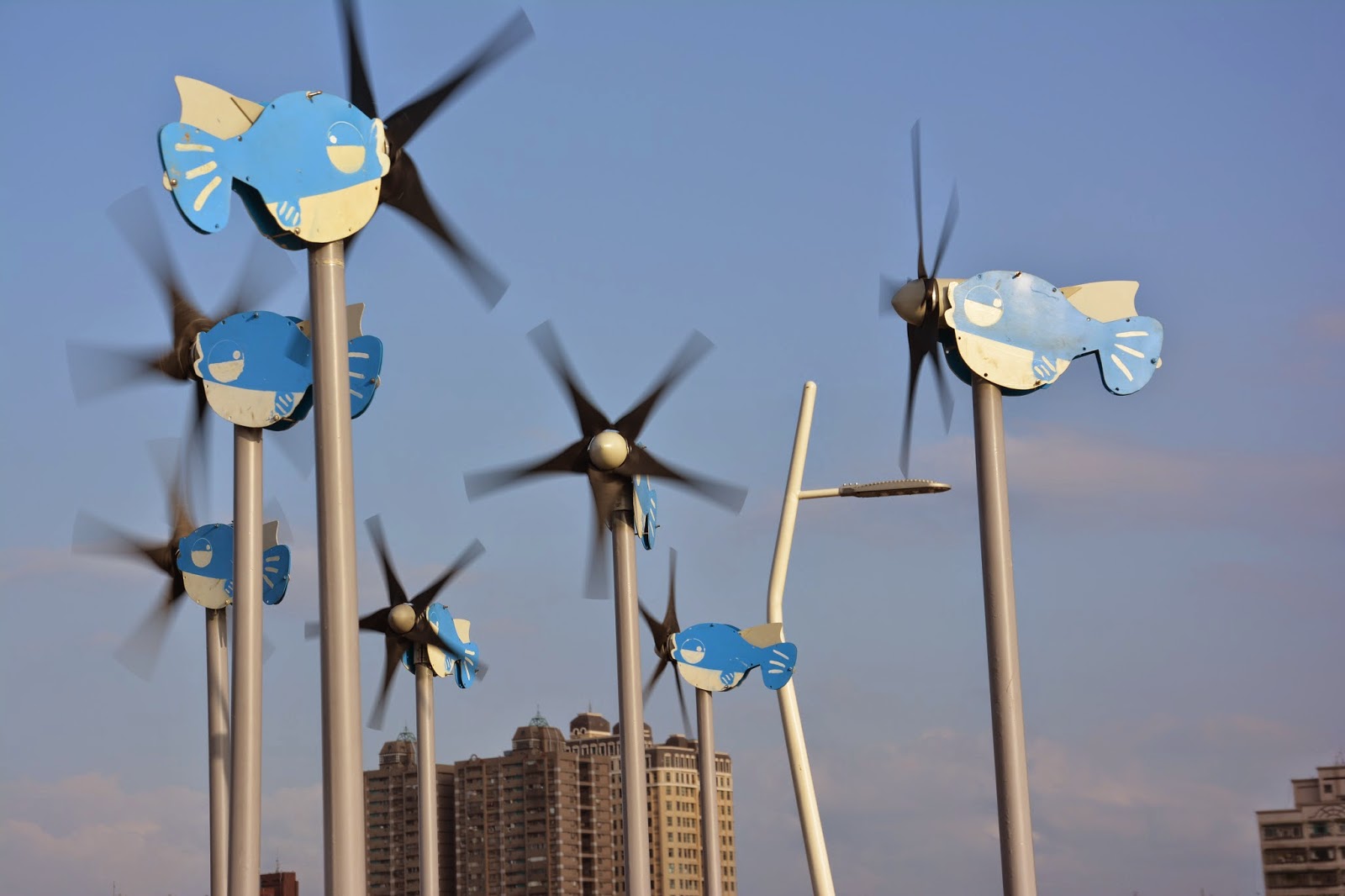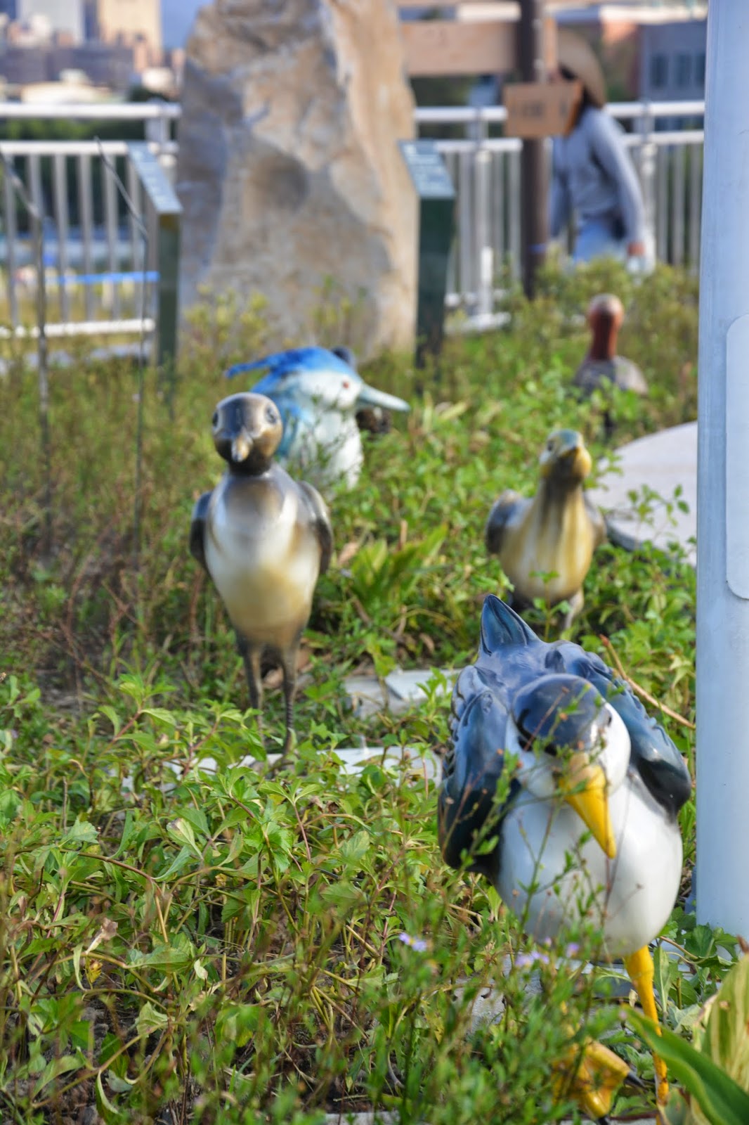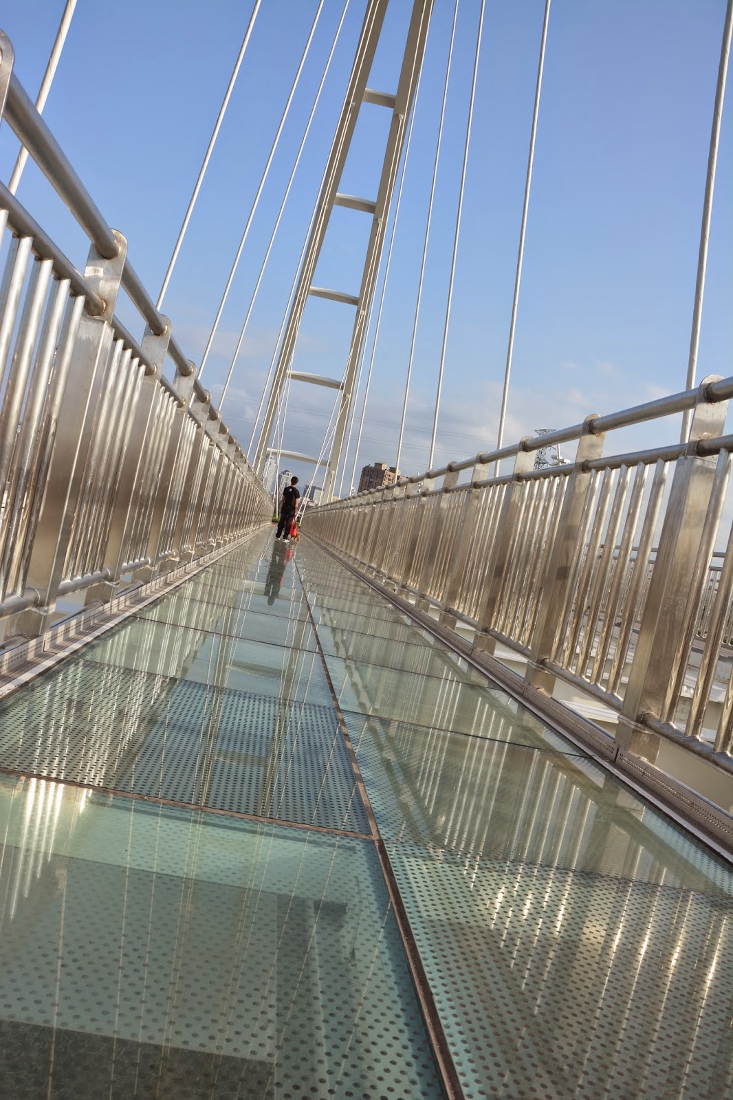 走過光之影後即進入水之舞的天空步道,天空步道是由透明的三層膠合強化玻璃構成,走在橋上可以感受大漢溪的風及浪。隨著潮汐的消漲,橋下的風浪跟著起伏,很有“行船人“的感覺,只是此時,人在橋上罷了!最後,進入風之律休憩區,抬頭看到河豚造形的風向計,在強風吹襲下,不停的旋轉;低頭看,則有各式水鳥造形的裝飾,吸引小朋友的注意力並達到教化功能。妾著往右是浮洲橋方向,往左則是新店碧潭方向。