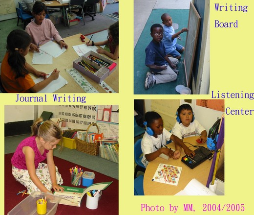 * Journal Writing – 提供膠水、剪刀、書寫畫圖工具、及一些過期雜誌或廣告紙讓小朋友自由剪貼圖案於自己的日記本裡 (journal),並練習寫下一些文字。