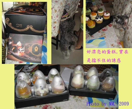 當然我和我家老爺以及小J的媽媽也品嚐杯子蛋糕,我們都很喜歡所以我們都是一小口一小口慢慢品嚐。小J媽媽試了一個芭娜娜之舞,有淡淡的香蕉口味,小J媽媽正在”減肥”,但是這個杯子蛋糕對她來說不甜不膩,也是剛剛好啦。我和我家老爺已經先嚐了有新鮮水果的杯子蛋糕,蛋糕的上層花樣對我們來說是五彩繽紛,可是蛋糕部分是我們”下評論”的重點 – 不甜,細緻多了,而且口味不同。不像是我們以前吃的美式的cupcakes蛋糕部分做的比較粗,上層的奶油真是甜吱吱。冰箱裡還剩三個杯子蛋糕,品嚐的時候可能要把家裡兩隻狗狗- 阿ㄆ一ㄚˋ&亮亮支開,這樣我們才能安心品嚐那三個碩果僅存的好東西。