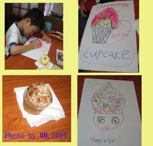 剛好下午小H和小J個別來上英文課,所以也請他們當個小小美食品嚐家,而且也趁機教教他們相關英文單字,他們也各自畫下所期望吃到新口味杯子蛋糕的圖畫。