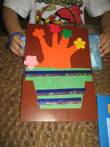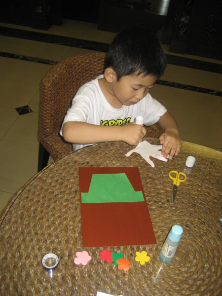 手作母親卡, 過程中我也不插手幫忙, 只告訴他該如何使用所提供的材料, 他