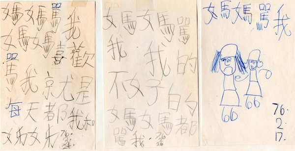 整理舊物,看到小女立恬小時候寫的字條、日記和短信,真有意思。 她從小勤學好問,愛塗塗畫畫,喜歡對照著中文歌詞唱歌,逐漸認識一些字。遇到想寫又不懂的字,問我怎麽寫、意思是什麽。三歲半就開始模仿書上的字形,畫出字來,字大大的,有點圓胖,很可愛。 天天學大人寫字,她樂此不疲的依樣畫葫蘆,進步很快,實際應用學會了的中文字,寫出諸如「我的不好的媽媽罵我」,還有「每天罵我和姊姊」的句子。每次都標明年月日,歷歷有據,好像我真的常常「罵」她們兩姊妹。小小年紀的她,大概把我規定孩子應該這樣那樣、不可以怎樣之類的生活提醒告誡,認為是「罵」,覺得傷了她的自尊心。 堅持己見、倔強的長女,挨駡的次數較多。比姊姊小四歲半又乖巧心軟的小女,見我不假辭色的指正她姊姊的行爲態度,深表同情,當然打抱不平;有時她自己也無辜連帶的被責罵,好冤枉啊!難怪寫了幾句發洩不滿。我以前未曾看過這張心情字樣。 打電話給已經長大為人母的小女,提起她小時候寫的東西非常有趣;上幼稚園學了英文,畫格子做了表,列出喜歡和不喜歡的同學姓名,記錄當時的感覺,並且不時更新名單內容。她還寫了心目中的媽媽該怎麽做才合理,頭腦清晰的條列詳細,證明了我對孩子未免聲調不夠溫和,該說是嚴厲、欠寬容,沒顧慮他們的感受。 不過,兩年後,她稍微長大,懂事多了,居然在小本子裏記下引用專欄作家安蘭德Ann Lander之語 : Sometimes parents should be "cruel" to be kind. (有時,父母應該以「殘忍」的方式來表達善意)。或許她多少明 白父母教導孩子的本意是好的。 時日已久,自我檢討,我犯了許多新手父母容易犯的錯,那便是對老大比較嚴苛,要求較多,第二個孩子就順其自然,很少指責。不過,每個孩子的個性不同,等待的方式也因而調整。 固然,年輕時不成熟,教養孩子或有處置失當之處,自認並不算是個兇媽媽,想不到卻給孩子留下如此印象,有些後悔。如果時光倒流,必定放下身段、改過遷善,做得更理想。可惜往者已矣,事過境遷,再也沒有機會。 如今回想,只好一笑置之了。 ** *** * 記得曾經掃描了「我的不好的媽媽罵我」,還有「每天罵我和姊姊」的句子字條。可惜現在沒找到那檔案,不知歸類在何處。--2024/09/17