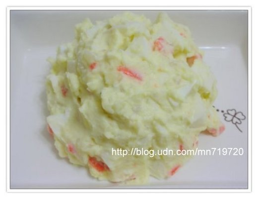 4. 馬鈴薯泥、蛋黃泥、蛋白丁、紅蘿蔔丁混合均勻,加入沙拉醬、鹽、糖、白醋、胡椒粉調味拌勻即可食用。