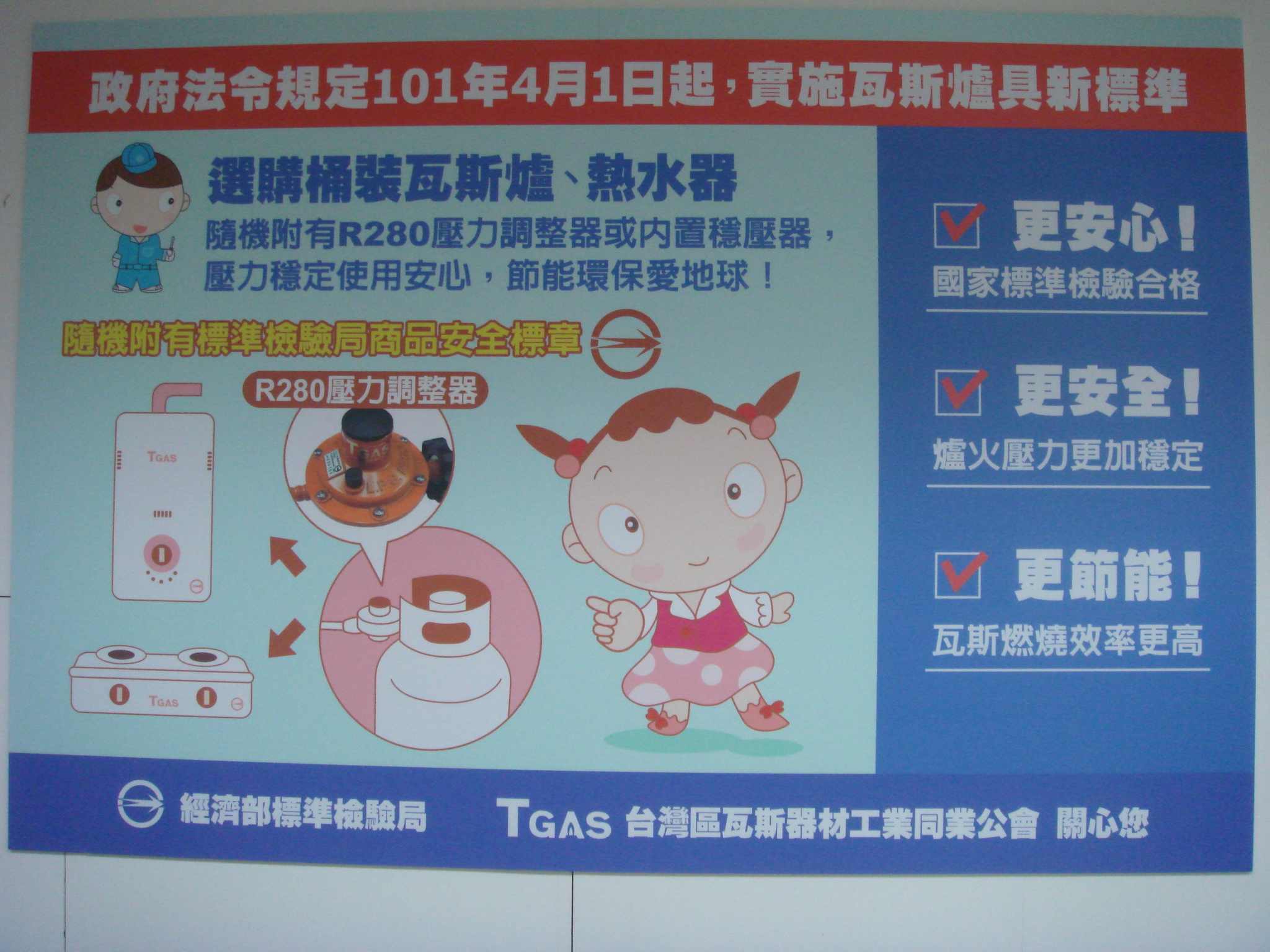 為保障消費者使用安全及促進瓦斯器具商品品質之提升,經濟部標準檢驗局將自101年4月1日起,對新申請檢驗之瓦斯爐、瓦斯烤箱及瓦斯熱水器,依100年3月25日修訂公布之CNS 13602~13605等4種家庭用瓦斯器具國家標準實施檢驗。該局表示,新舊版標準主要差異有器具熱效率之提高、燃燒廢氣中一氧化碳(CO)濃度之降低、成品標示之加強,以及使用液化石油氣(俗稱桶裝瓦斯)之器具應附隨R280壓力調整器或裝設穩壓器,讓民眾使用起來更安全更節能。該等CNS標準修訂期間,台灣區瓦斯器材工業同業公會極為支持,出力甚多。