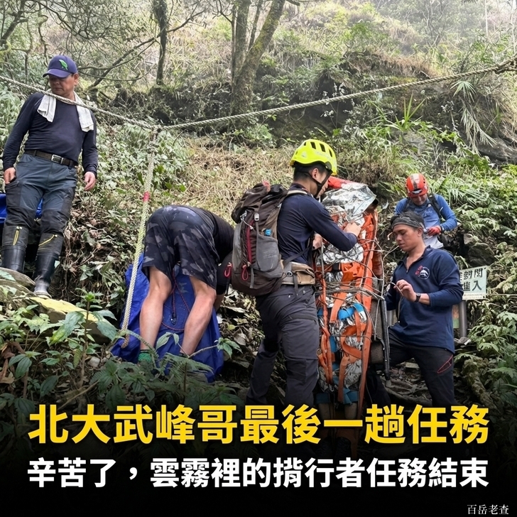 欲言言哽咽,揮涕涕流離。浮雲目斷蒼山外,落月魂聚在山巔。58歲的高山協作蔡明峰,0306日進行北大武山檜谷山莊運補作業時,在步道2K處不慎墜崖身亡。他這一生,行山愛山,協助多多山友完登百岳,為人客氣,敦厚老實,負責盡職,瀟灑淡定頗有大將風,這一鮮明印象永留在相處過之山友心中。峰哥,願此去,千里煙波,應是良辰好景,無須向誰說?照片一.引自鄭清原山友2026.03.08.FB,是峰哥本尊之登山照;照片二.引自2026.03.08.「我是屏東人」FB,是搜救隊合力將峰哥大體送出登山口情形。