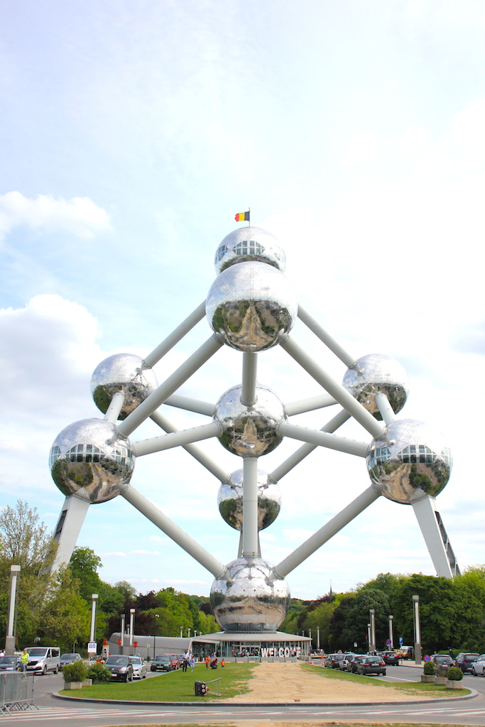 陽光照射,原子球塔銀光閃閃。抬頭觀賞,8個球位於正方體的8個角,另1個球體位於正方體中心。它,是科學的藝術品,建築界的怪異。原子球塔的九顆球體並未全部開放參觀,其中一項是永久展覽是關於鋁的歷史。旅客可以搭電梯、扶梯、電梯到各開放的球體,參觀當期的展覽。電梯的激光燈裝置,好像上太空船的感覺。站在最高點,360度觀賞布魯塞爾美不勝收的全景。