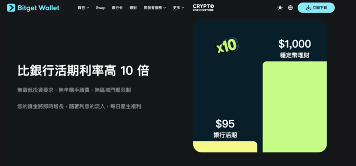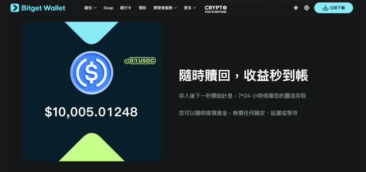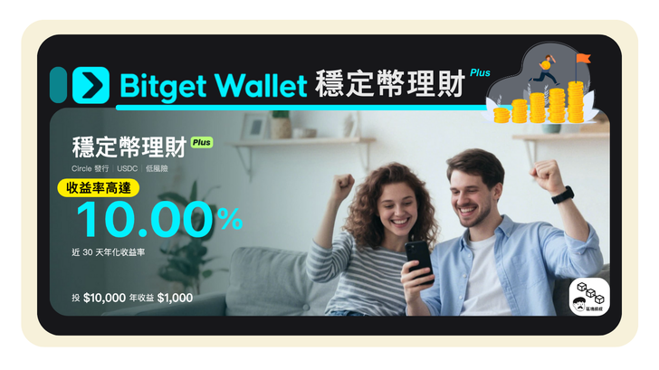 | Bitget Wallet 穩定幣理財 Plus | 約 10% APY(首週優惠更高) | 幾乎隨時可存入與取出,門檻低 | 穩定幣本身沒有價格波動大風險,但借貸協議、對手方、政策風險仍存在 |