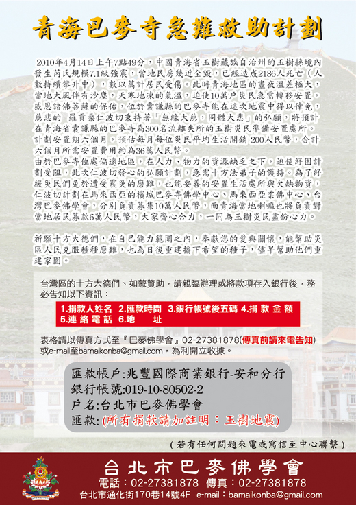 為了紓緩災民們免於遭受震災的磨難,也能妥善的安置生活處所與欠缺物資,仁波切計劃在馬來西亞的檳城巴麥寺佛學中心、馬來西亞柔佛中心、台灣巴麥佛學會,分別負責募集10萬人民幣,而青海當地喇嘛也將負責對當地居民募款6萬人民幣,大家齊心合力,一同為玉樹災民盡份心力。