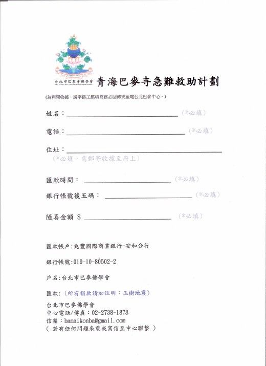 傳真巴麥佛學會02-27381878 (傳真前請來電告知)