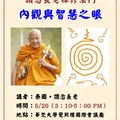 2015年5月20日(三)下午3點起讚念長老應邀至華梵大學開示 「內觀與智慧之眼」