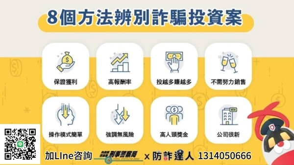 宣稱「保證獲利」、「穩賺不賠」、「短期高回報」,例如「每月20%收益」、「翻倍獲利」。實際:合法投資必有風險,超高報酬通常伴隨高風險或根本是騙局。