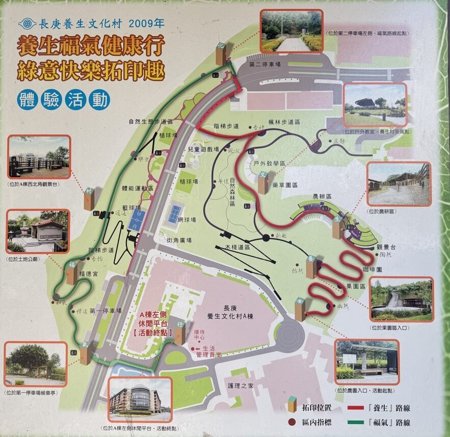 ↓我們今天要走地圖左側綠色的「福氣步道」,而後跨過中間的長青路,再走右側紅色的「養生步道」。我們的車子停在地圖左下方的第一停車場。