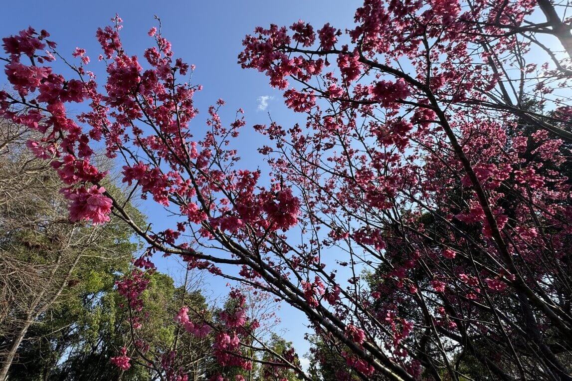 ↓櫻花就長在木棧道旁,可以近距離地親近櫻花,櫻花以重瓣緋寒櫻(八重櫻)為主。