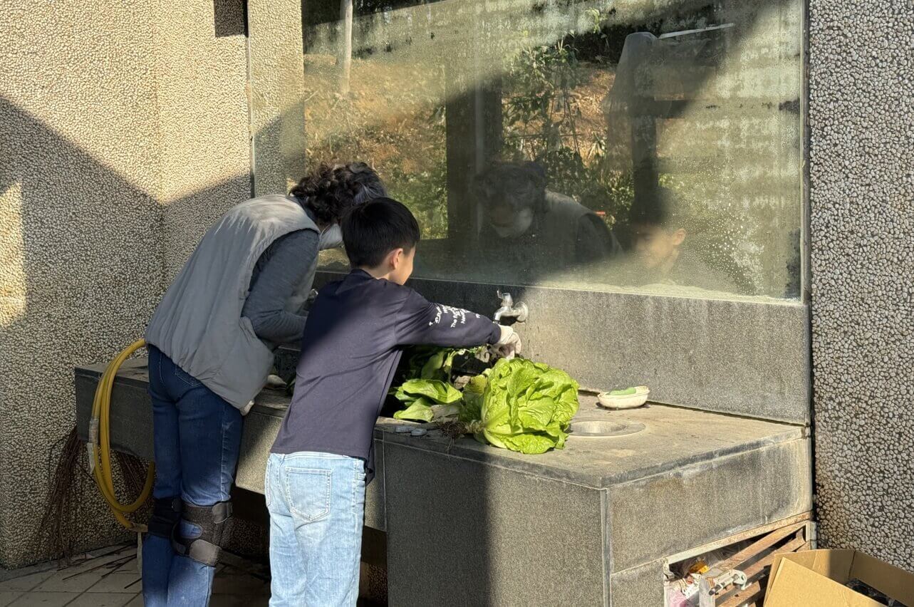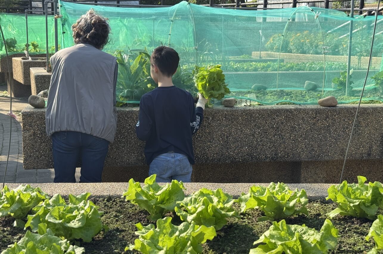 ↓奶奶帶著孫子摘菜收成,享受天倫之樂。