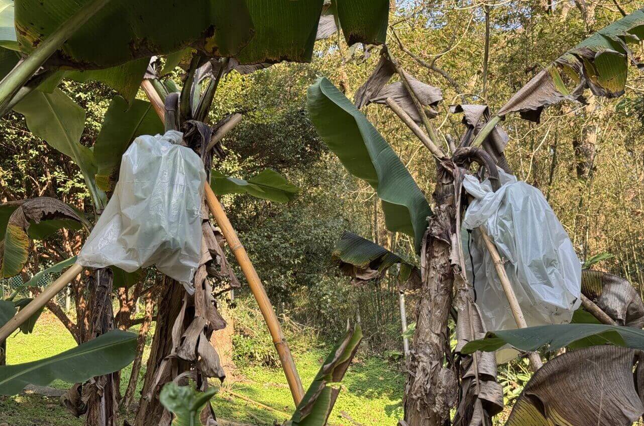 ↓香蕉已套袋等待收成。