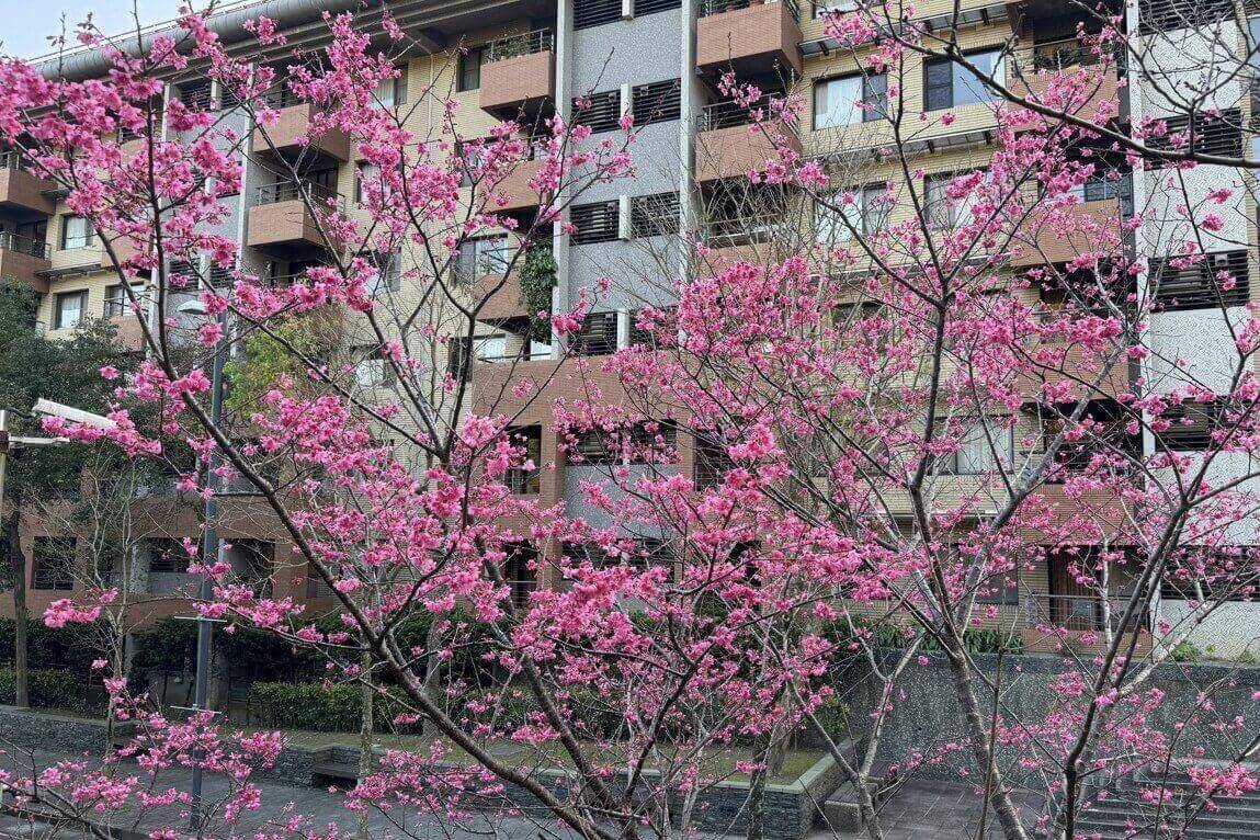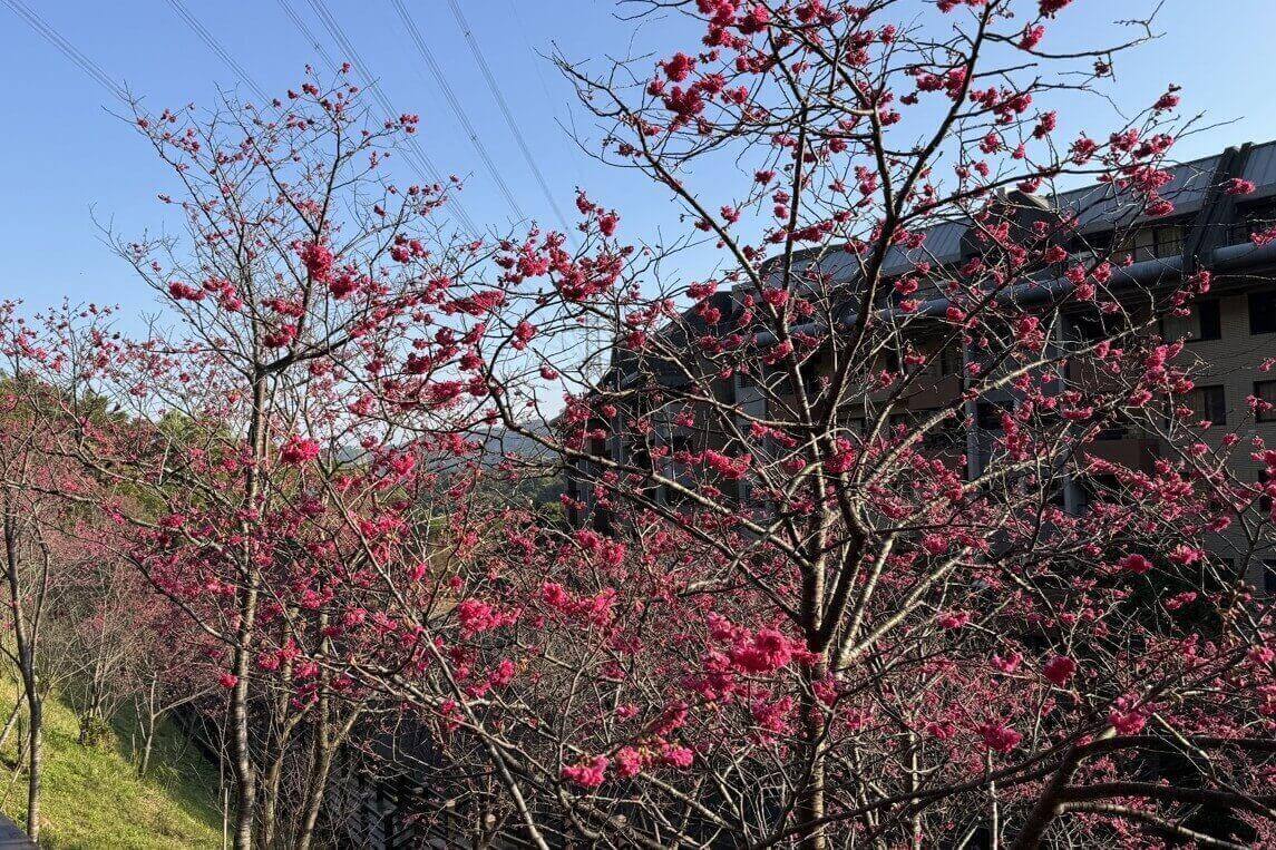↓櫻花步道旁是養生村的住宿區,賞花時,務必注意聲量,勿打擾到住戶。而對住在花海第一排的住戶來說,一拉開窗簾,就有大片的櫻花可賞,豈不快哉!
