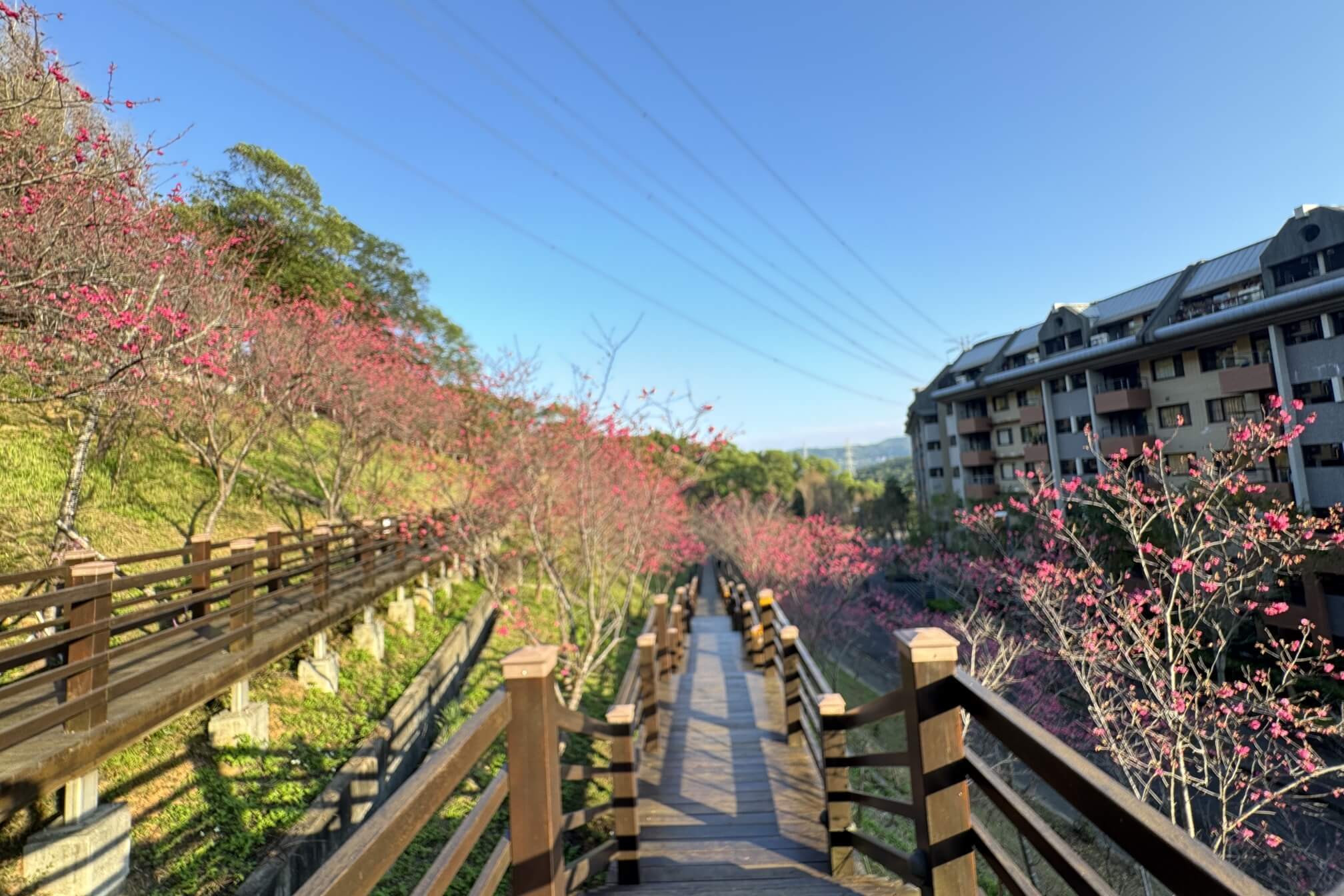 ↓眼前兩段木棧道的櫻花樹最為密集,不過,櫻花僅開約3~4成,待滿開期間,必定花海翻騰、遊客如織。