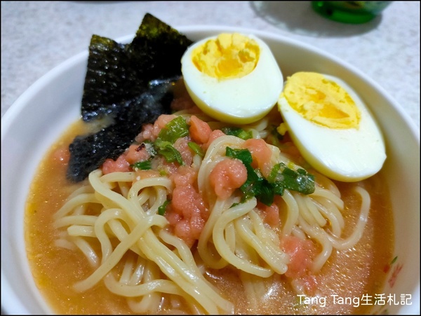 沒有叉燒肉片,所以放顆白煮蛋和海苔片,這碗一幻蝦味噌拉麵在視覺上感覺豐盛多了。(笑)