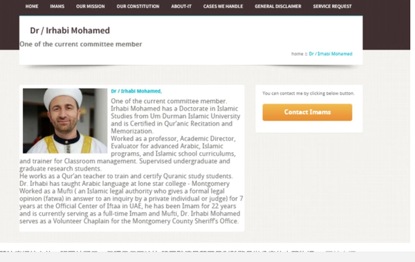 伊斯蘭法庭網站上的一張圖片顯示,伊瑪目伊爾哈比·穆罕默德是蒙哥馬利縣警長辦公室的志願牧師。 |圖片來源:IslamicTribunal.org