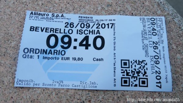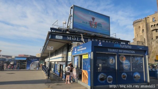 (2017/9/26)早餐後走向渡輪碼頭,碼頭有幾家渡輪公司,價碼都相差無幾,我購買Alilauro渡輪公司前往伊斯基亞島(Isola d’ Ischia)的單程渡輪票19.5歐元,碼頭豎立一座超級大的電子看板,所有船班的資訊一目了然。
