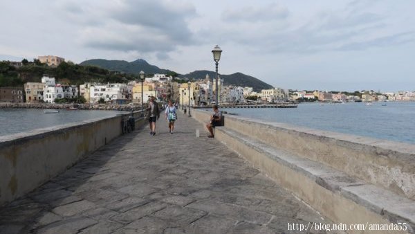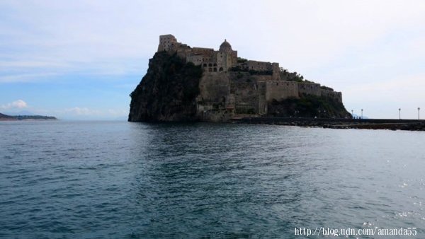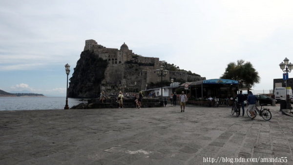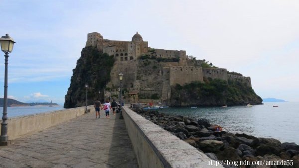 街道盡頭出現一條約200多公尺的堤道通往另一座小島,阿拉貢城堡座落於島嶼之上,城堡的歷史可追溯到公元前400年左右,當海盜入侵時這裡成為島民的避難之地,15世紀西班牙國王阿芳索五世(Alfonso V 1396~1458)在位時,下令修築阿拉貢城堡(Aragonese Castle)。城堡內有教堂、修道院、陵墓、監獄、地窖、綠野….等等,進入城堡費用10歐元。