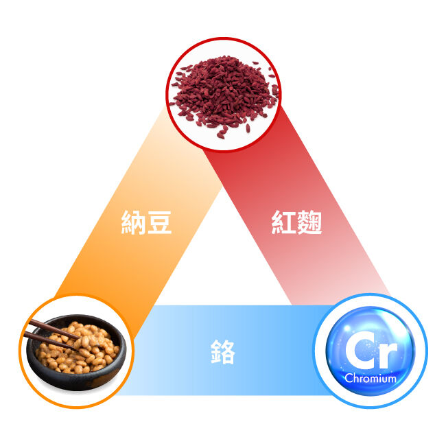 在眾多與代謝相關的營養素中,紅麴、納豆與鉻都是經常被提及的代表,不僅都有相當多的討論及研究,相當巧合的是,紅麴、納豆與鉻,分別守護代謝的不同面向,組成完整的「營養守護三角」:促進新陳代謝、積極調整體質、維持醣類正常代謝。