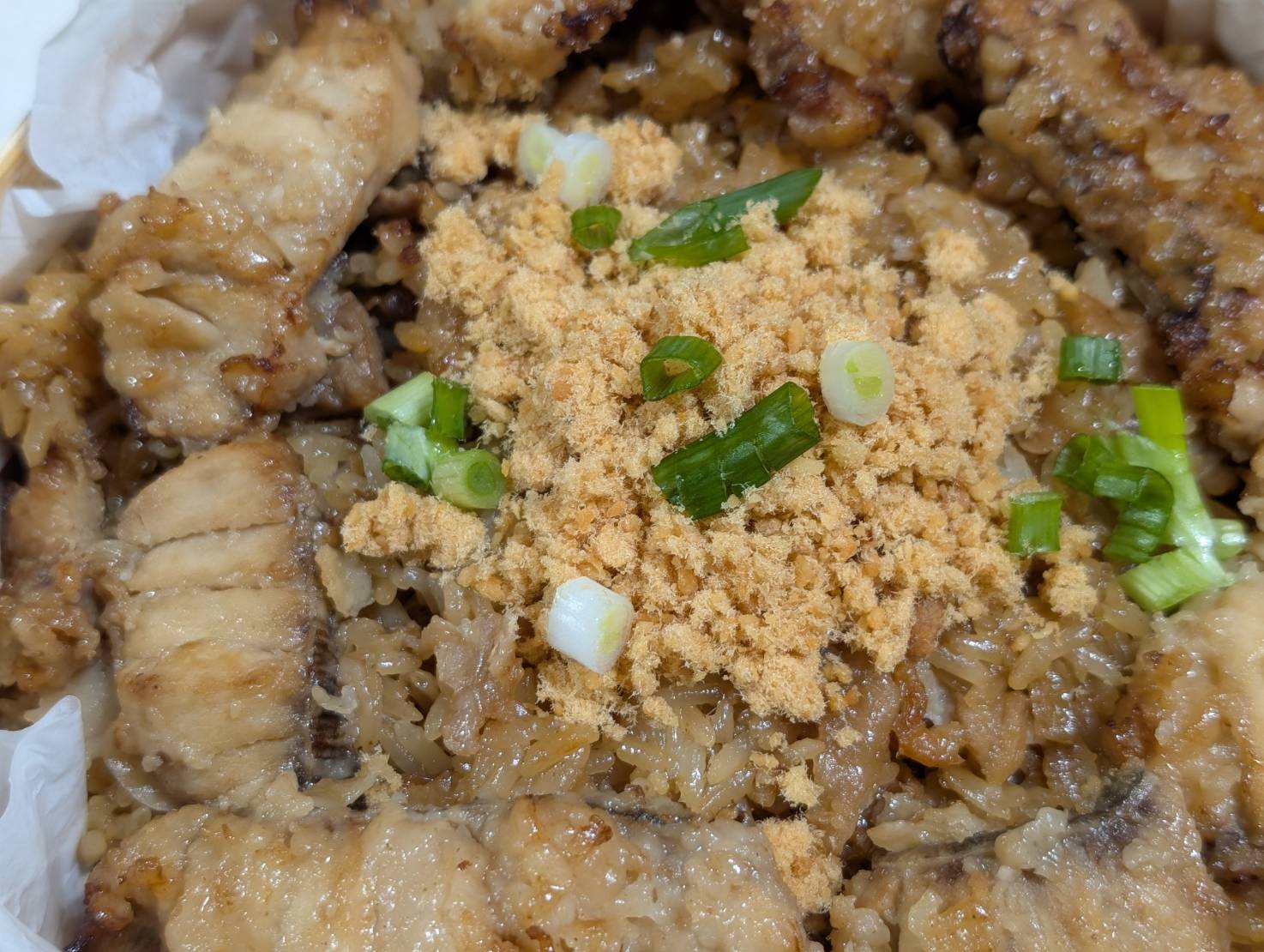 大火拌炒,鎖住油脂香氣, 最後鋪上香酥旗魚酥,太誘人了!