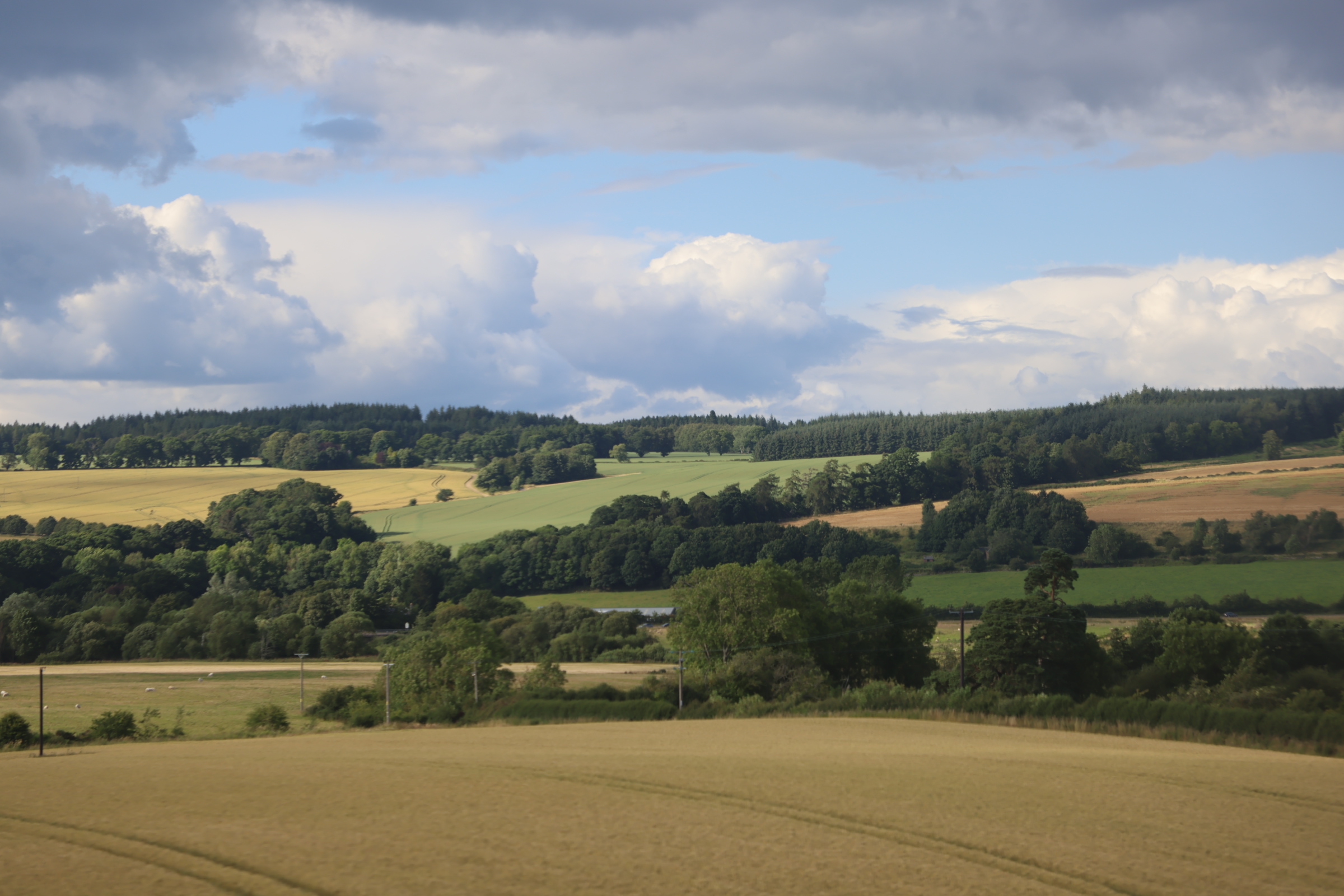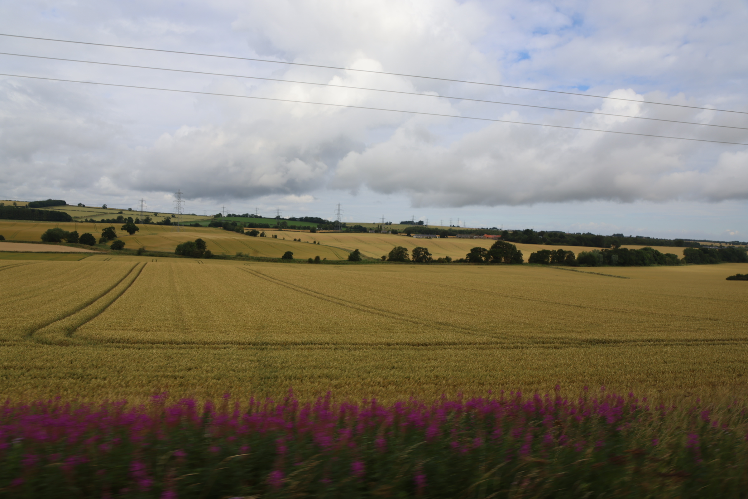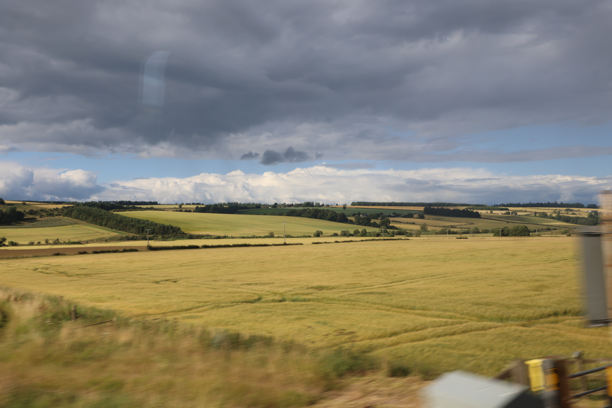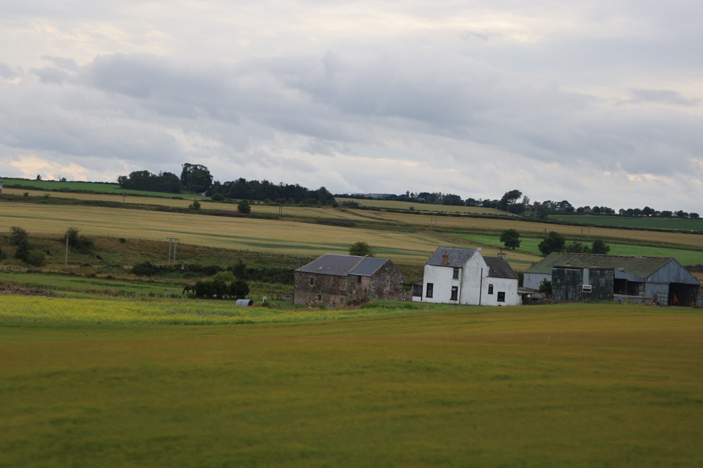 在東部的平原,七、八月是小麥等農作物收成,或即將收成的季節,一路上的麥田,在英格蘭有部分已開始收割,越往北收成時間就越晚,我們從愛丁堡搭乘火車到茵弗尼斯,行經蘇格蘭高地,一路上還是黃澄澄的麥田,中間被一道道供農機行走的道路隔開,形成很美的圖案,斜陽下,麥浪翻風,白雲悠悠;在西部的丘陵地帶,則見到不少牧場,一畦一畦以矮石牆隔開的翠綠草地,牛羊悠閑倘佯其間,天高野曠,詩情畫意,令人難忘。