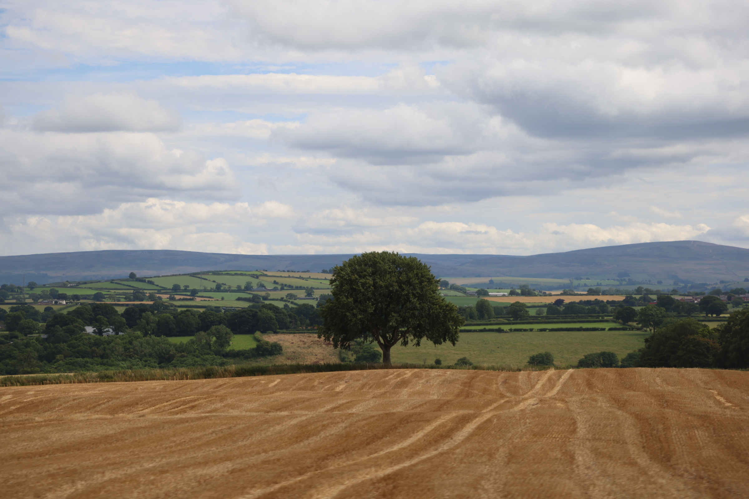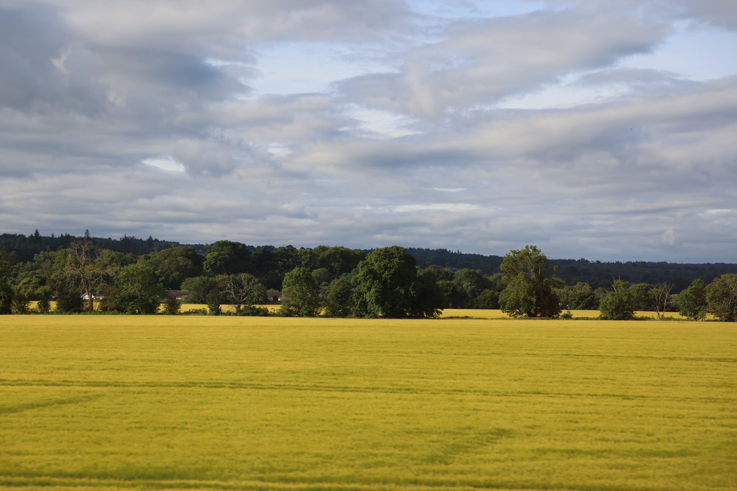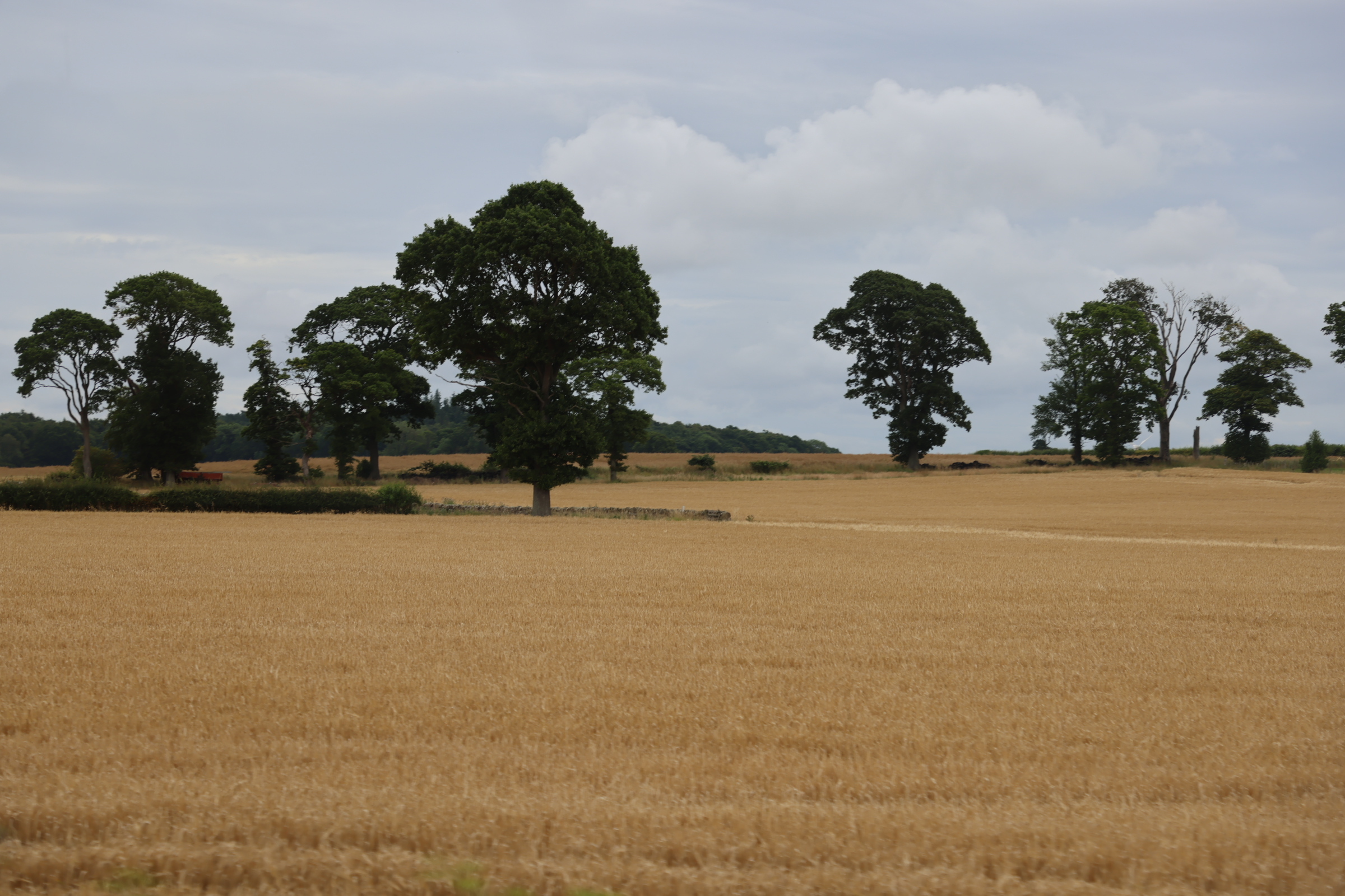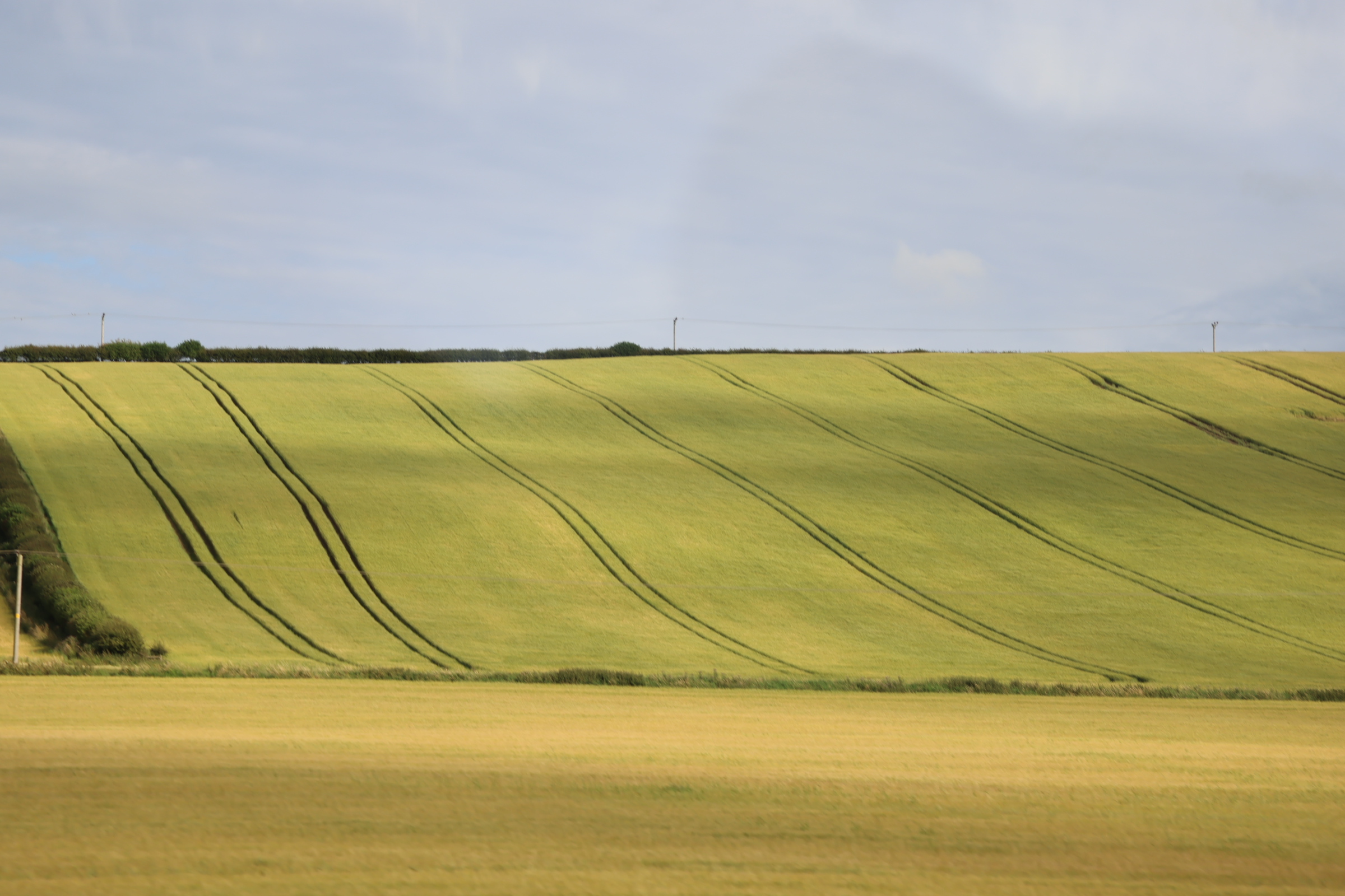 在東部的平原,七、八月是小麥等農作物收成,或即將收成的季節,一路上的麥田,在英格蘭有部分已開始收割,越往北收成時間就越晚,我們從愛丁堡搭乘火車到茵弗尼斯,行經蘇格蘭高地,一路上還是黃澄澄的麥田,中間被一道道供農機行走的道路隔開,形成很美的圖案,斜陽下,麥浪翻風,白雲悠悠;在西部的丘陵地帶,則見到不少牧場,一畦一畦以矮石牆隔開的翠綠草地,牛羊悠閑倘佯其間,天高野曠,詩情畫意,令人難忘。