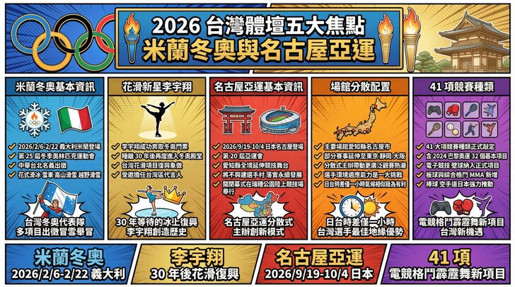 2026 年將是國際體壇精彩絕倫的一年,台灣選手將面臨兩大綜合性賽會的考驗:分別是 2 月於義大利登場的米蘭-科爾蒂納丹佩佐冬季奧運,以及 9 月於日本舉辦的名古屋亞運會。中華代表團屆時將以「中華台北」名義出征,爭取在冰雪舞台與亞洲賽場再創巔峰。然而,隨著競賽種類的調整,特別是名古屋亞運取消了台灣傳統強項「滑輪溜冰」,這無疑為中華隊蟬聯獎牌榜榮耀投下了巨大的變數。本文將詳盡解析這兩大賽會的籌備現況與台灣選手的奪牌展望。