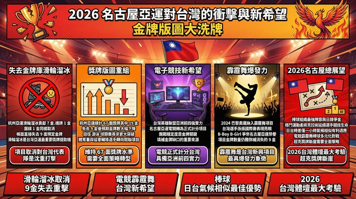 霹靂舞的爆發力: 隨著 2024 巴黎奧運將霹靂舞納入,台灣選手孫振等人在國際賽的表現亮眼,名古屋亞運也將是這群 B-Boy 與 B-Girl 爭奪榮譽的主戰場。然而,這些項目在金牌數量上仍難以與消失的 9 金抗衡,中華代表團的整體策略必須更為多元。