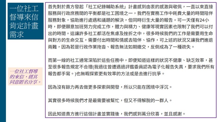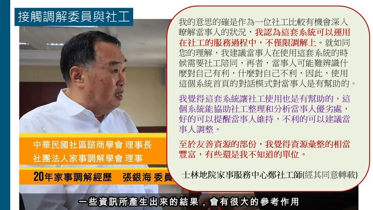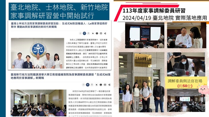 台北場的座談會現場,主辦單位也邀請到東吳大學社工系謝文中副教授主持, 另有士林地方法院家事服務中心的黃竑瑄督導及桃園第三區早期療育發展中心的劉尹筑督導到現場進行對談, 分享他們實作後的觀察與反思。但是在以下的影片中就不播出,集中在本系統的相關介紹。感謝《太報》記者吳尚軒的現場報導。全文連結如下:〈「報告寫不完」成社工夢魘 清大教授開發AI系統盼減壓〉