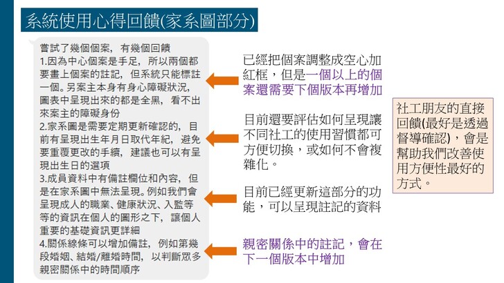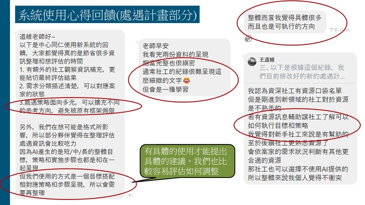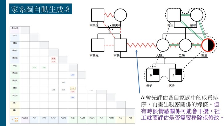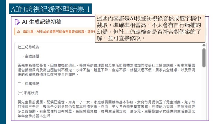 目前這個已有五個AI輔助的功能:(1)訪視錄音轉逐字稿、(2)訪視紀錄生成、(3)處遇計畫生成、以及近日新增的(4)家系圖生成與(5)社福資源整合搜尋,使得這個AI社工輔助系統對社工訪視紀錄的協助功能可以更加完備。希望更多社工可以瞭解如何善用這個AI工具改善社工紀錄的品質與效率,進而提升社工服務的核心價值,增進助人工作者的尊嚴與意義。
