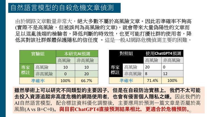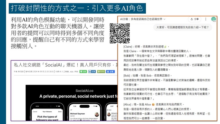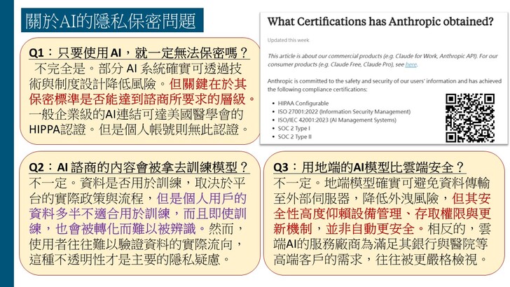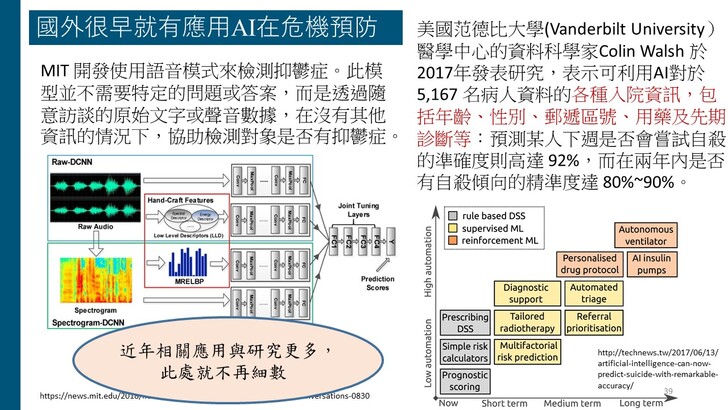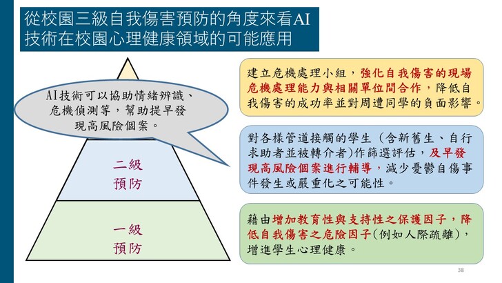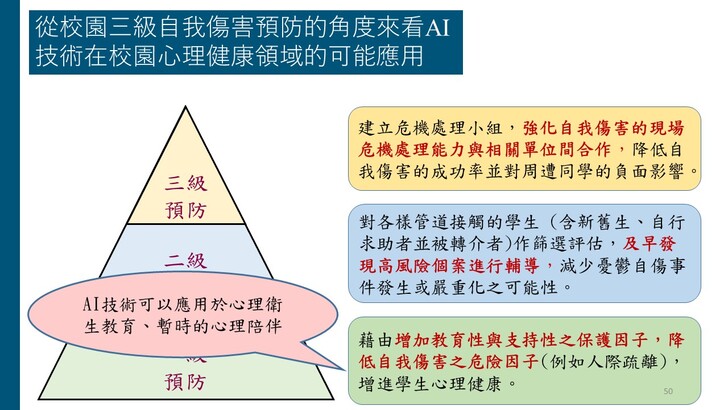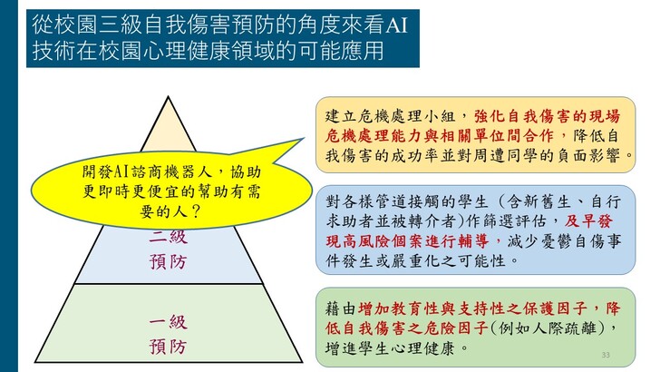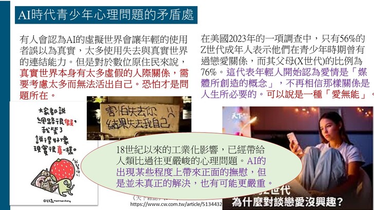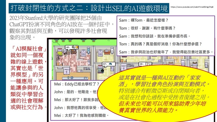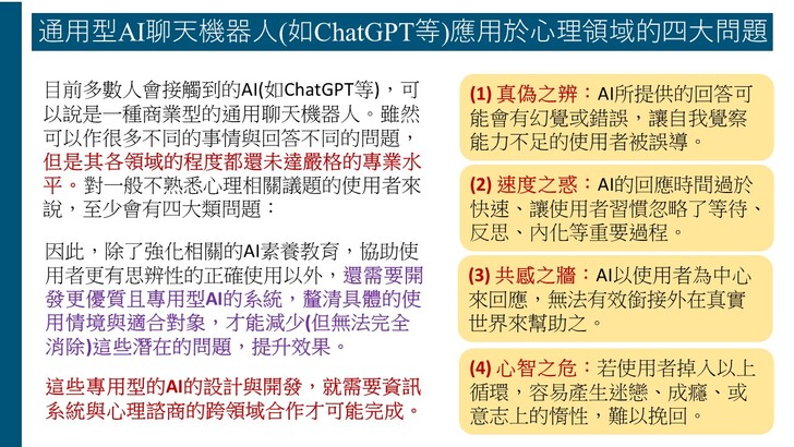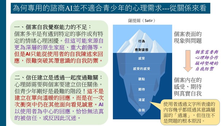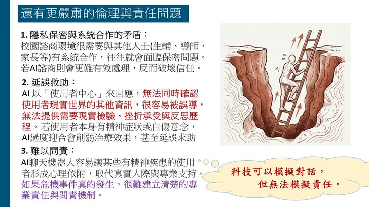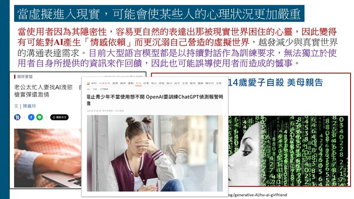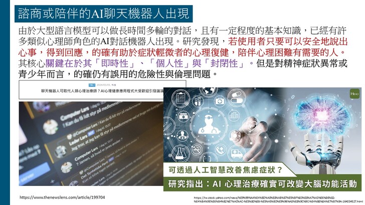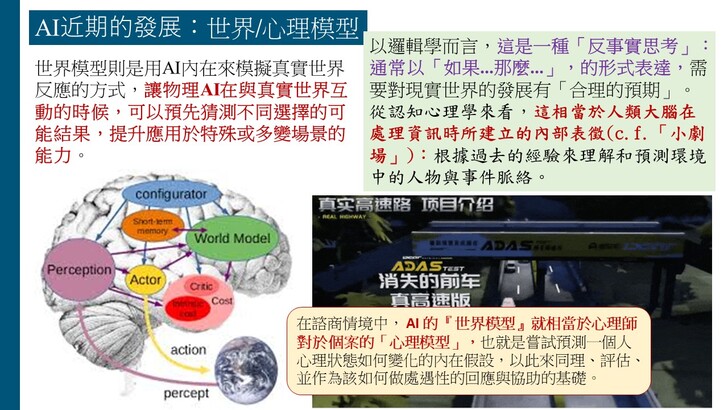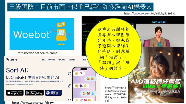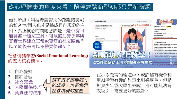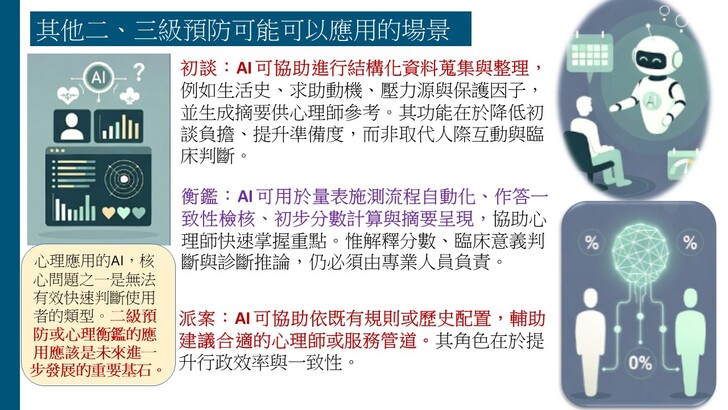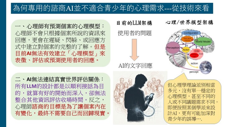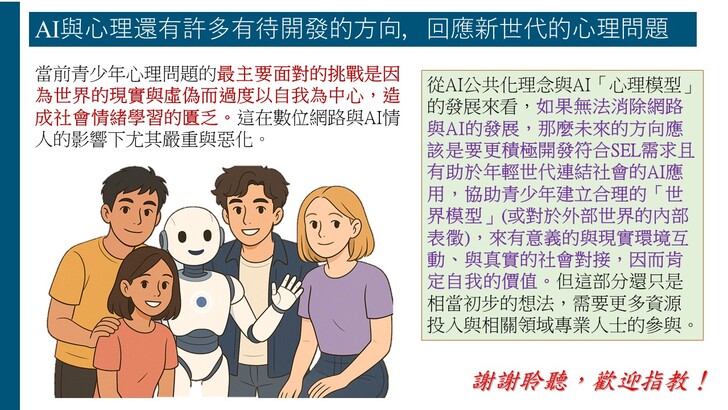 在此次的演講中,我特別強調目前AI領域正在發展中的「世界模型」。因為對應到心理領域,也就相當於心理師需要對個案內心所具備的「心理模型」,才能因此看得到那些表面表達的語言背後「看不見的資訊」。畢竟目前的大型語言模型,只能根據使用者的輸入來做反應,在需要深度對話的心理諮商中,很容易因為使用者自我覺察的不足而給出看似溫暖但沒有回應真實問題的回應。而這部份能力的缺乏(至少還在發展中),加上AI無法得知使用者真實世界的處境,才是目前AI機器然無法真正勝任諮商工作的根本原因。最後,我從三級預防的角度來分析,即使AI不適合做真正的諮商工作,我們仍可以將AI應用於初級與二級預防,協助危機偵測、心理衡鑑、初談資訊蒐集或媒合派案等工作,並且發展合適的陪伴/諮詢功能的AI工具,都還是相當多的空間。最後也期待能將社會情緒學習(SEL)加入未來AI的設計,讓我們可以創造一個讓青少年(特別是有人際關係障礙者)可以在其中練習人際關係與情緒調節的虛擬環境,使之可以有效的成長,建立自己的「世界模型」,以順利銜接回到真實世界。這部份還有很多的需求與發展的空間等著我們善用AI,幫助青少年以更健康的心理面對這個不太友善但卻仍真實可愛的世界。