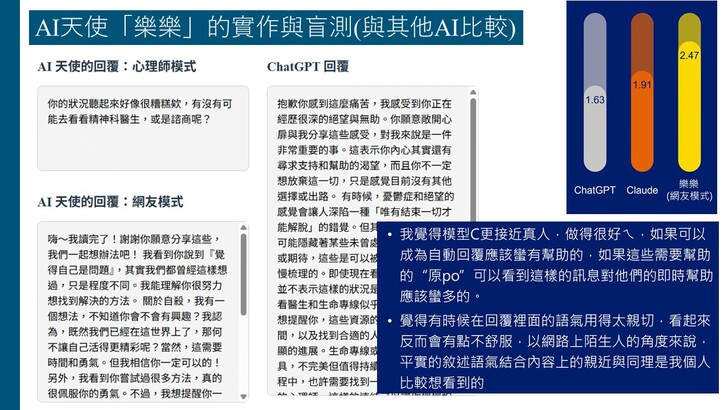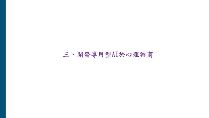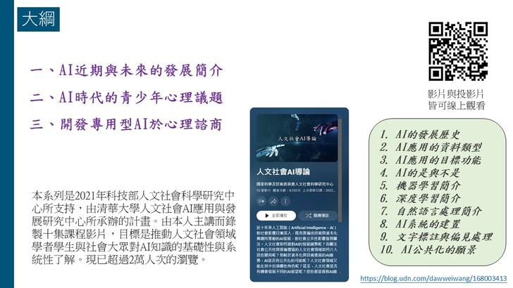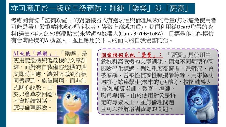以下為我們AIFR研究團隊目前(-2025)所作的,在心理領域的AI系統開發簡介影片。其中「樂樂」的介紹是從3:26開始,「憂憂」的介紹從5:20開始。