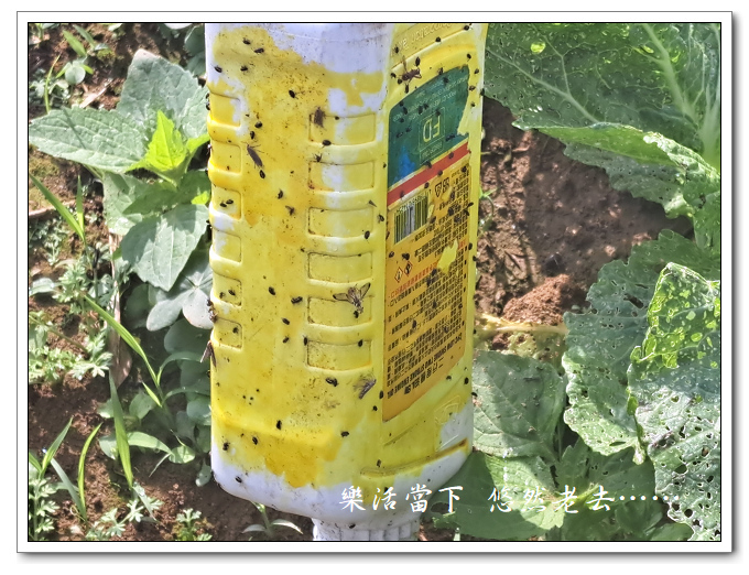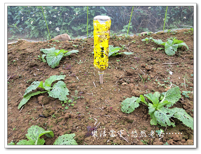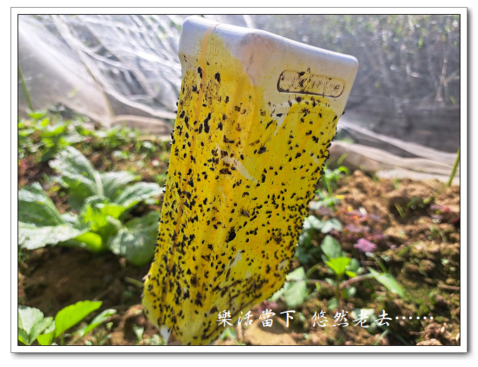 這次芥菜的黃條葉蚤蟲害嚴重,不得不下重藥,在小小的芥菜區塊中使用了四支黏劑。