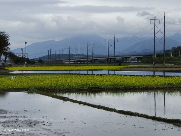 山側一排電線桿默默地陪伴著公路,時而乍見金黃油菜花田,亮麗動人!....加上天候宜人,車輛甚少,行走其中,不急不徐,實感幸福。