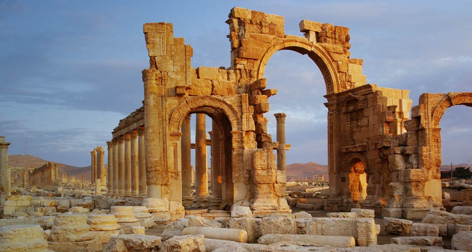 敘利亞帕爾米拉古城Great Colonnade at Palmyra_).稱為敘利亞沙漠的新娘。挺拔的神廟、氣派的凱旋門、兩側高聳的石柱、精工細作的雕刻、美輪美奐的壁畫,加上金色陽光的渲染,彷彿在提醒著人們它昔日的輝煌。廢墟的帕爾米拉也依然壯觀,交融了東西方藝術智慧的宮殿富麗堂皇,讓後來的參觀者有了對古人的欽佩與崇拜。