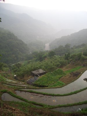 至善路370巷口,一大清早已停了好幾部比我們早到的車。我們從大崎頭的登山口起步。雖然一開始就是緩升坡,但石階是屬親子級的步道 (看多了登山標示圖,我才知道原來步道依長短難易度有分級,分為親子級、勇腳級及山友級),所以這親子級的步道還算輕鬆自如。沒幾分鐘就走到半山腰的梯田旁,此時回頭一望,至善路遠遠地已在腳底下了。 梯田間的流水聲加上山間微風及鳥鳴,讓人舒爽快意!