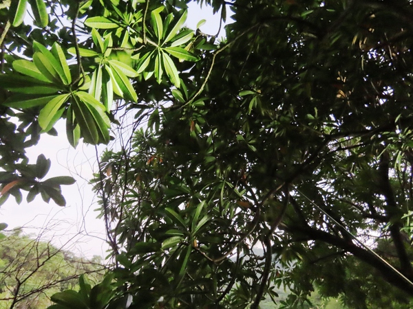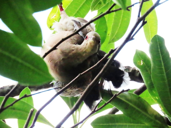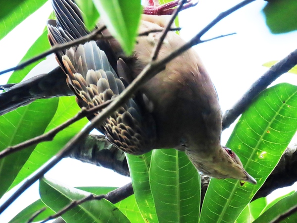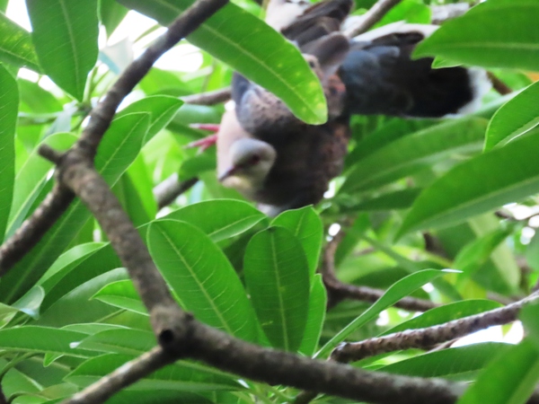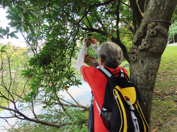 公園散步,一位有多面之緣的遊客叫住我,告訴我湖邊海檬果樹上有一隻鳥被釣魚線纏住,無法脫身,我趨前近看是隻金背鳩