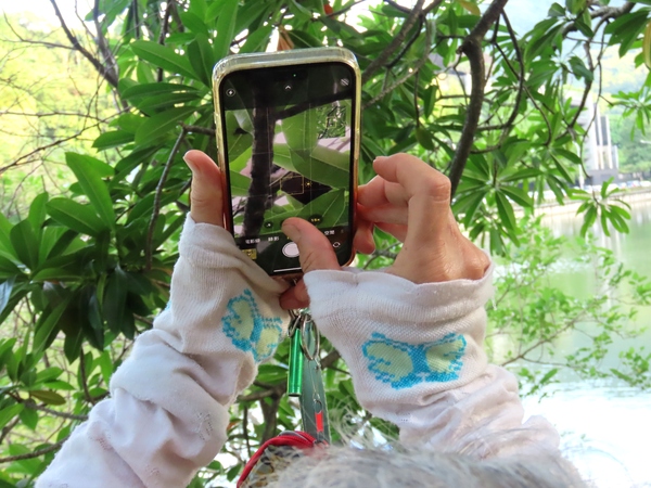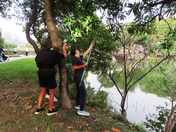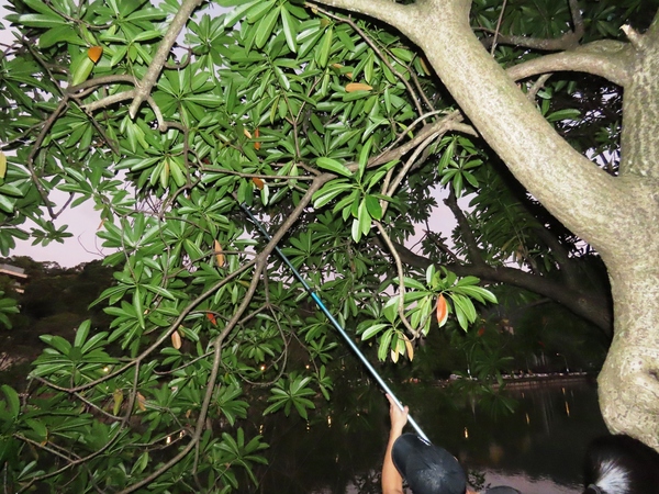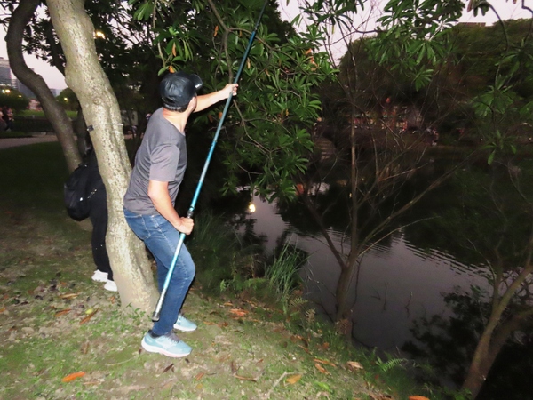 今天假日,南港公園管理所沒上班,有好心人打1999市民熱線求助救鳥,也沒有回應,我便向湖邊釣魚人借工具,也沒有夠長的竿子搆得著金背鳩懸吊的位置