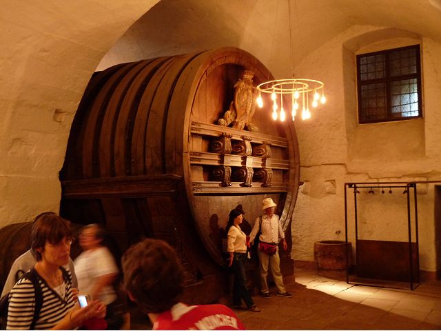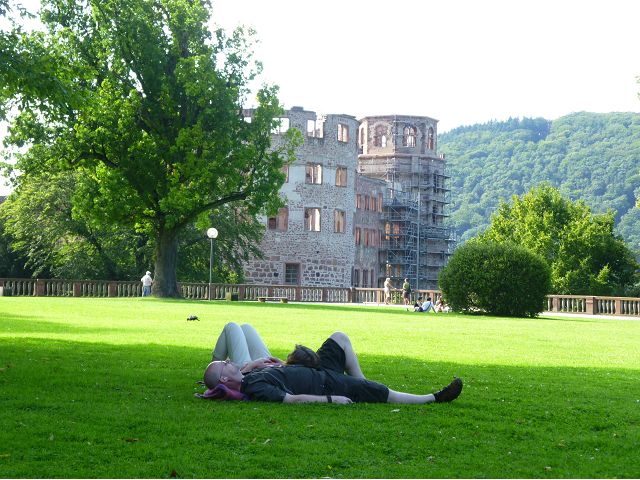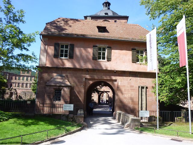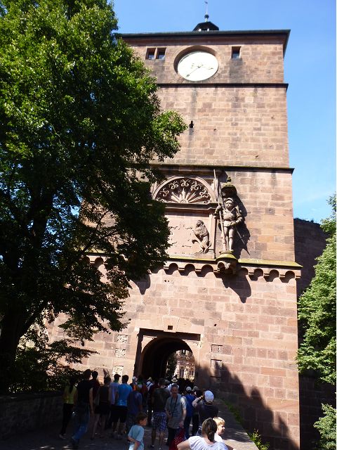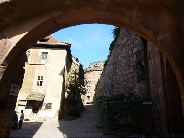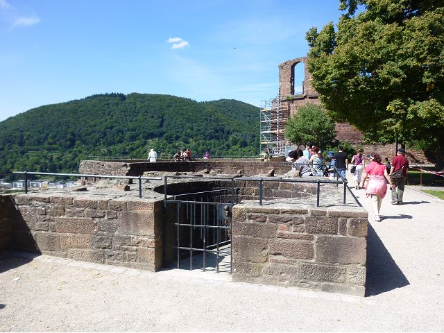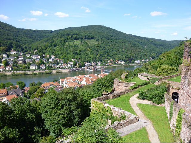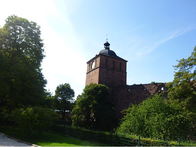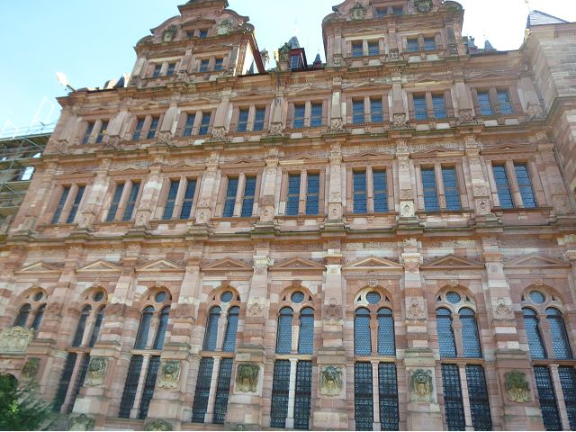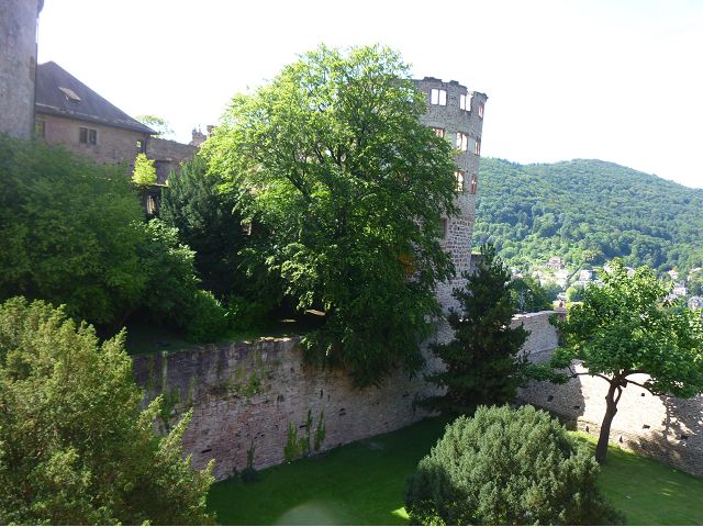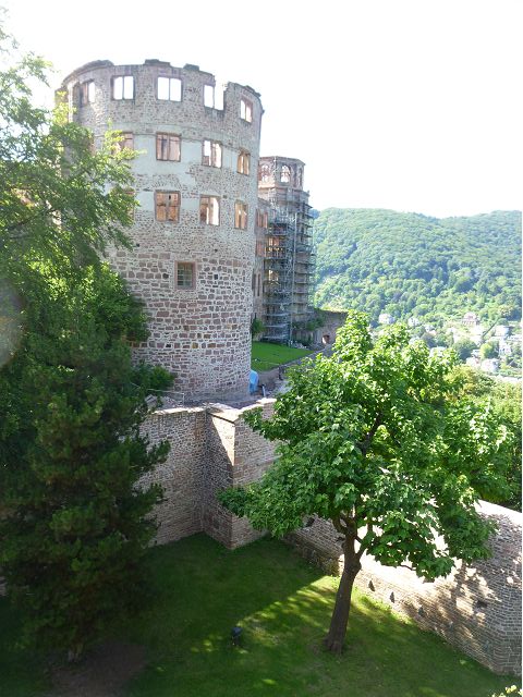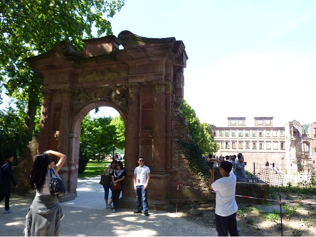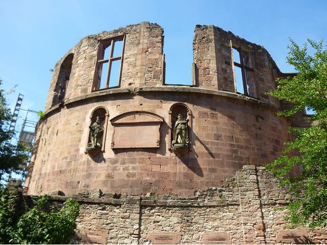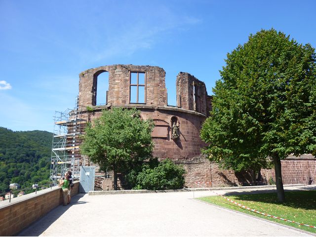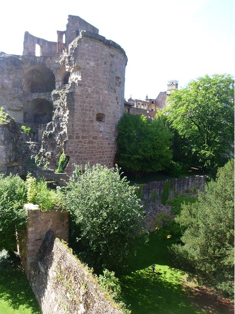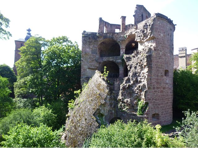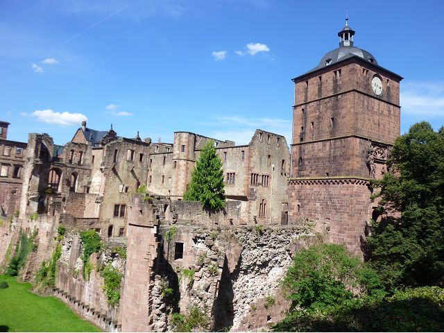 目前,德國著名旅遊勝地的海德堡城堡,其實是城堡廢墟遺跡。"海德堡"小城邑於1196年出現在歷史文獻中,1214年成為法爾茨選帝侯宮邸所在地,海德堡大學設立後,逐步成為當時歐洲的政治、經濟、文化重鎮。最早的城堡建於1240年,1294年擴展成兩個城堡,由海德堡領主也是神聖羅馬帝國選帝侯魯普雷希特(Ruprecht III)開始不斷修建,樣式融合了哥德、文藝復興和巴洛克風格,成為屹立於山丘上的雄偉壯觀軍事堡壘,悠久歷史之間迭次經歷閃電摧毀、擴建重修和戰爭破壞,但卻躲過二戰轟炸,戰後還成為駐歐美軍總部所在地,才維持住現在遺跡模樣,即使如此,漫步其中,還是可以感受到濃濃的中古世紀氣息,如:門樓托爾圖姆(Tortum)建於1531~1541年間,雕刻著象徵魯普雷希特一世在神聖羅馬帝國皇家地位的菱形紋章,厚重的木質主門依然存在,還設置一座時鐘。藥草塔樓(Krautturm)如同被切的蛋糕般而引人注目,藥房塔下方 尖頂要塞(Spitzkaponniere),三角尖頂通道只留許多小小的槍眼射擊口,是建於16世紀初的城堡防禦工事。城堡擴建為堡壘,除了厚厚的防禦城牆外,四周巨大的塔樓還有東北角的八角形鐘樓(Glockenturm),連接玻璃走廊(Gläserne Saalbau),西側城牆厚實的迪克塔樓(Dickerturm,胖塔)連接著城堡北牆,看起來就是翼護著華麗的腓特烈樓(Friedrichsbau)防禦任務。