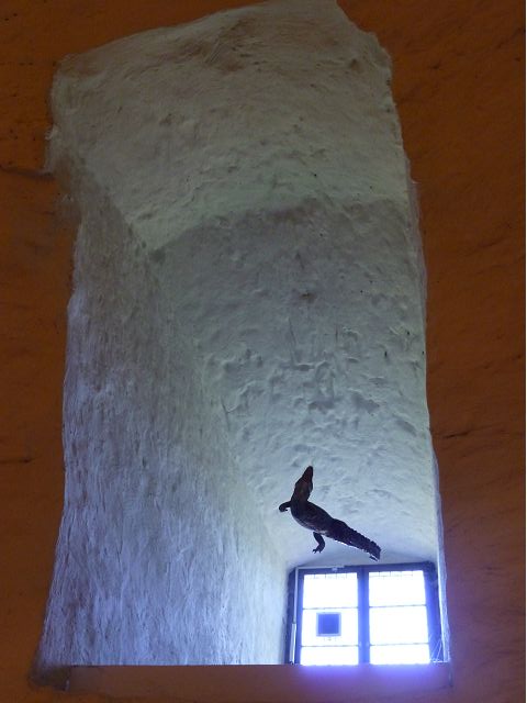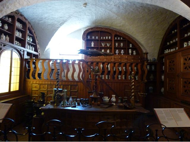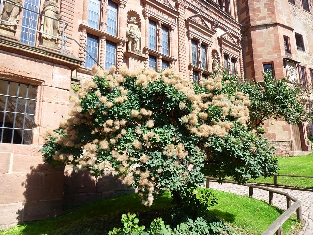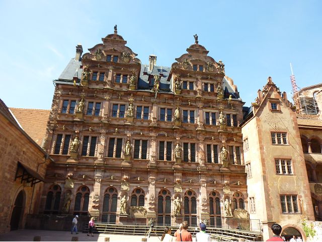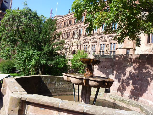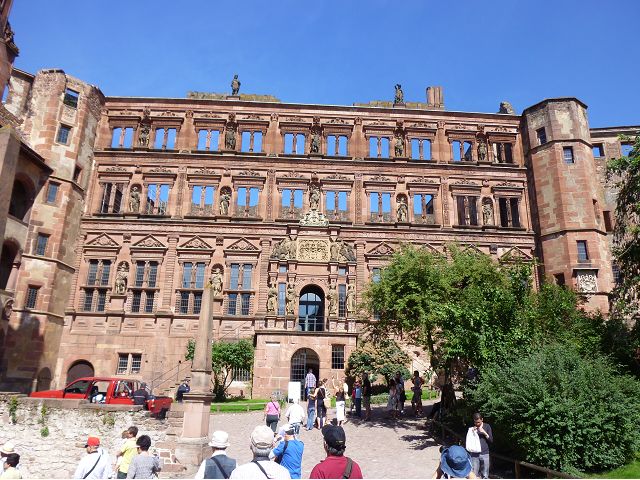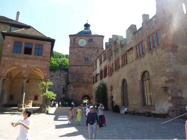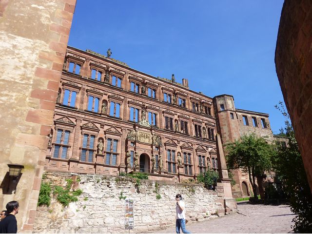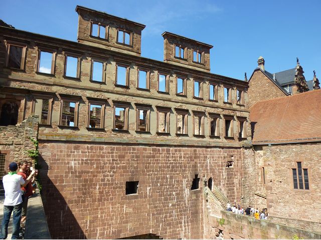 從門樓跨入城堡內院,首見左手旁的魯普雷希特樓(Ruprechtsbau),由選帝侯魯普雷希特一世約建於1400年代初,是城堡建築群中最古老的建築,紅色砂岩立面小塔樓、圓拱門、零星的窗戶等,仍保留完好的哥德式入口和立面,也是罕見的中世紀建築典範。內院中心腓特烈樓(Friedrichsbau),由選帝侯腓特烈四世於1601~1607年間興建,是華麗的黑色山形屋頂、紅色砂岩建築,外牆立面上有歷代祖先雕像,展現傲人的權力和家族血統;地下室的大酒桶(Großes Fass),建於1735年是當時德國最大的酒桶之一,可容納超過22萬公升的葡萄酒。 庭院右側奧托海因里希樓(Ottheinrichsbau),建於1556~1559年,美麗的紅砂岩建築本來擁有雙尖屋頂,是德國文藝復興時期最著名的古老城堡建築之一,但歷經法國軍隊燒燬和雷擊損害後,沒有屋頂,只剩下外牆與一樓;底層德國藥房博物館(Deutsches Apotheken Museum),展示17至19世紀實驗室、儀器、藥物、修道院藥劑師的彩繪櫃台等,從中可看出當年藥局模樣和略窺西藥發展,只是不知道為何懸掛鱷魚?是否和當年時代背景有關?在現場參觀斷簷殘壁,感覺城堡建築群古色古香,帶點兒殘破悽涼美感,讓人眼花撩亂,反不若大酒桶、藥房博物館受遊客歡迎,其知名、叫座程度,居然喧賓奪主,也讓人意外呢。